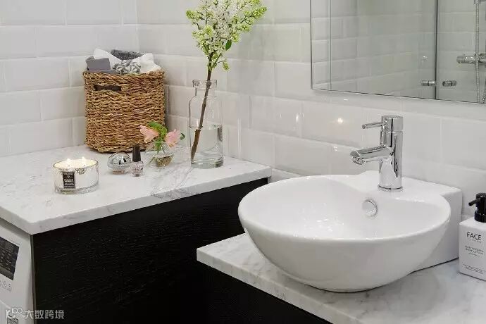 黑白的洗漱区,在一枝高挑的嫩绿与两朵粉红的映衬下,弱化了它的冷酷与单一。