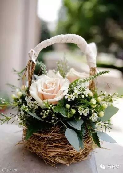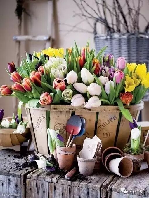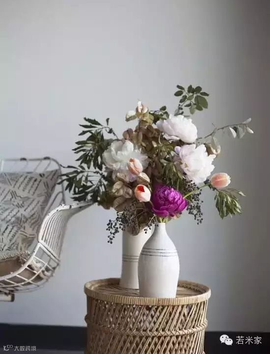 ▲竹藤和柳条编制的器皿田园气息浓郁,须放入小水盆、花插或花泥,以便盛水和固定花枝。