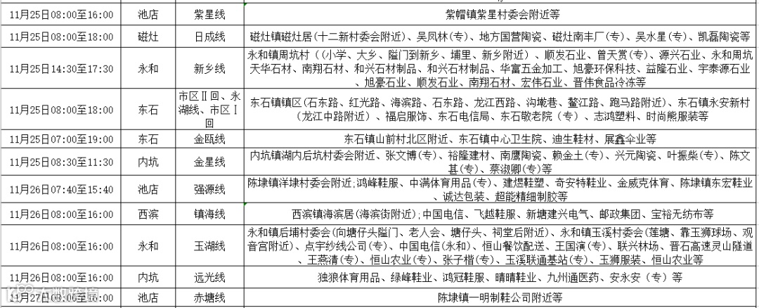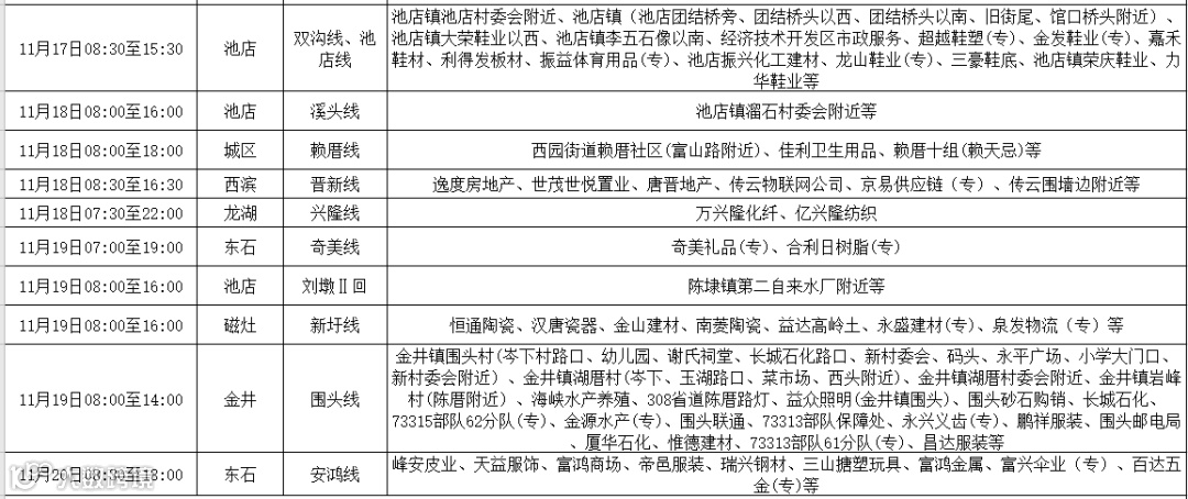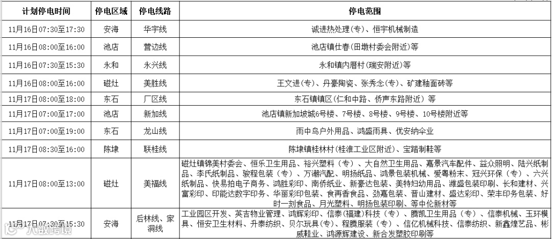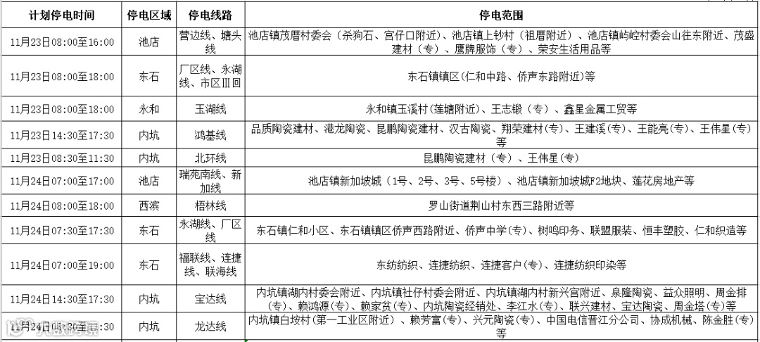 因客户工程,配改工程,用户申请,市政工程,低压工程需要,拟对下列线路进行停电,请停电范围内各用电户做好准备。若遇下雨等特殊原因,可能取消相应区域停电。实际送电时间以现场施工进度为准。给您造成不便,敬请谅解,感谢您的支持!安全提示:在停电期间,线路随时可能恢复送电,任何单位和个人应当遵守《电力法》,《电力设施保护条例》等有关法律法规的规定,不得攀登变压器台架及杆塔,禁止盗窃,破坏电力设施,禁止在电力设施保护区内从事法律法规所禁止的行为,否则,将自行承担法律责任。电力统一报修服务电话:95598,晋江区域用户可拨打:82558255。