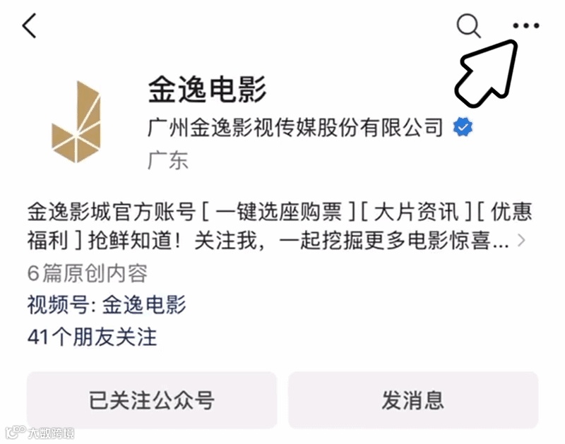 ①点击【金逸电影】公众号名片;②点击右上角的“三点”图标;③点击“置顶公众号”,本公众号入口就会出现在您的微信对话框最上面咯!