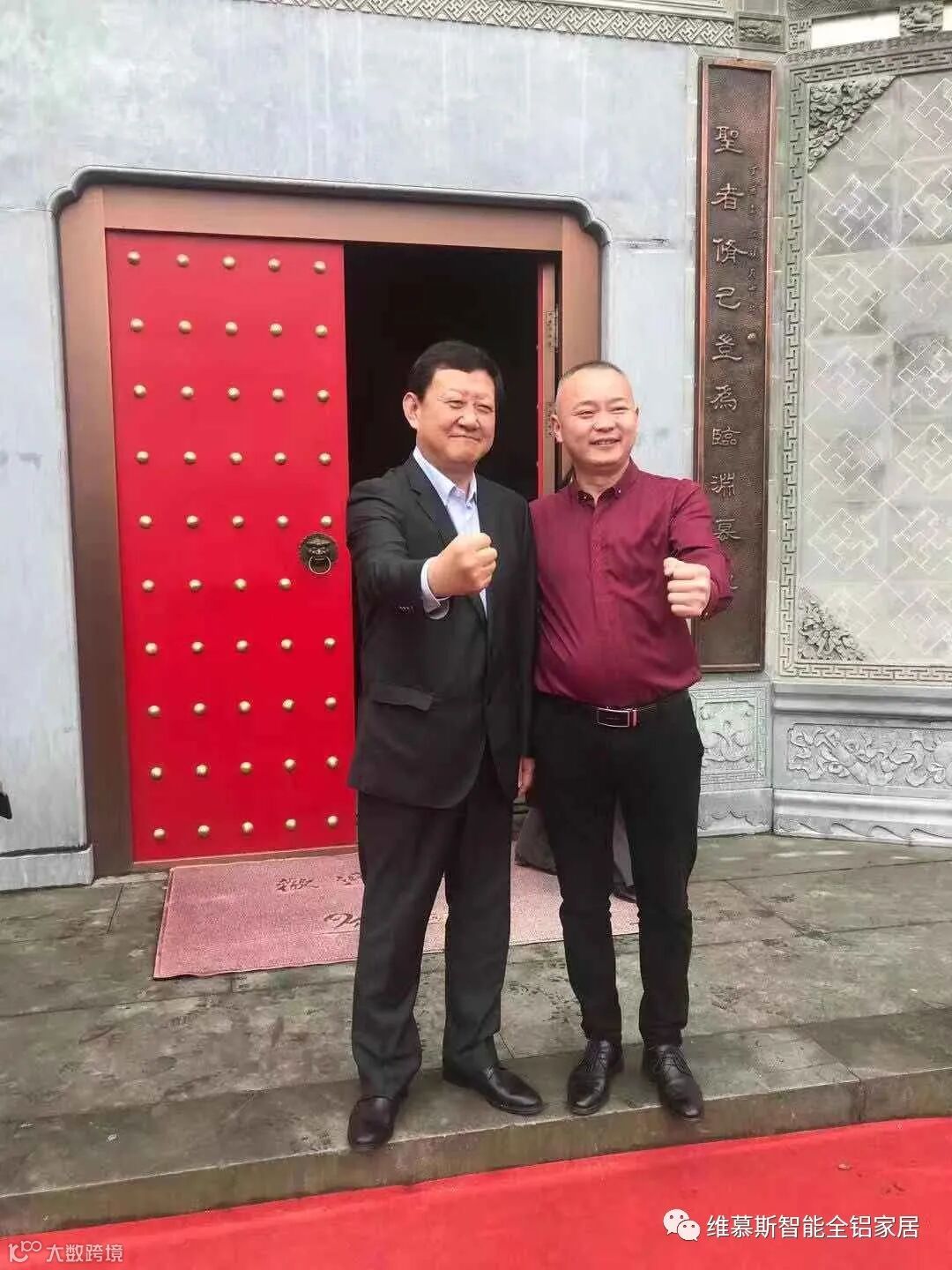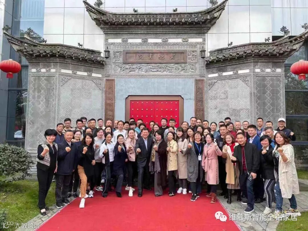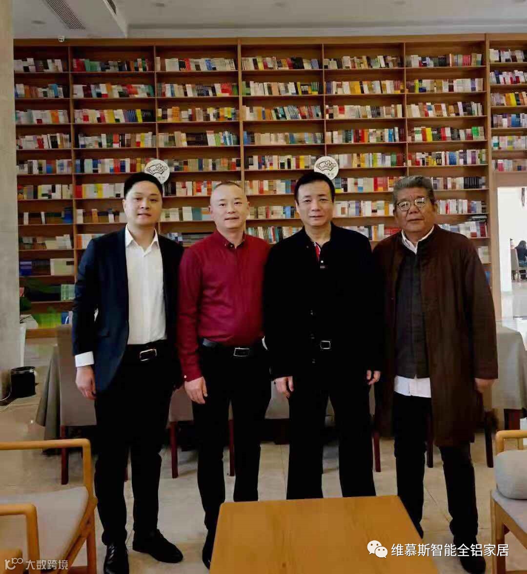 维慕斯控股集团程总、郭总分别与聖德书院品牌战略导师、著名品牌专家、中国3.15论坛创办人、中关村科技企业促进会万力会长,聖德书院文化战略导师张奎杰先生,圣德书院院董黄山新界文化传播公司董事长刘平先生在维慕斯全铝大型书柜前合影留念。