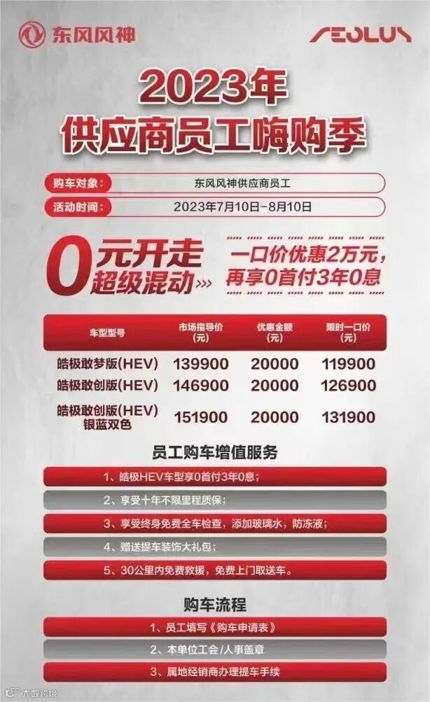 咱们新阳荣乐的东风客户针对皓极车型(油电混合)推出供应商职工内部购车优惠活动啦!