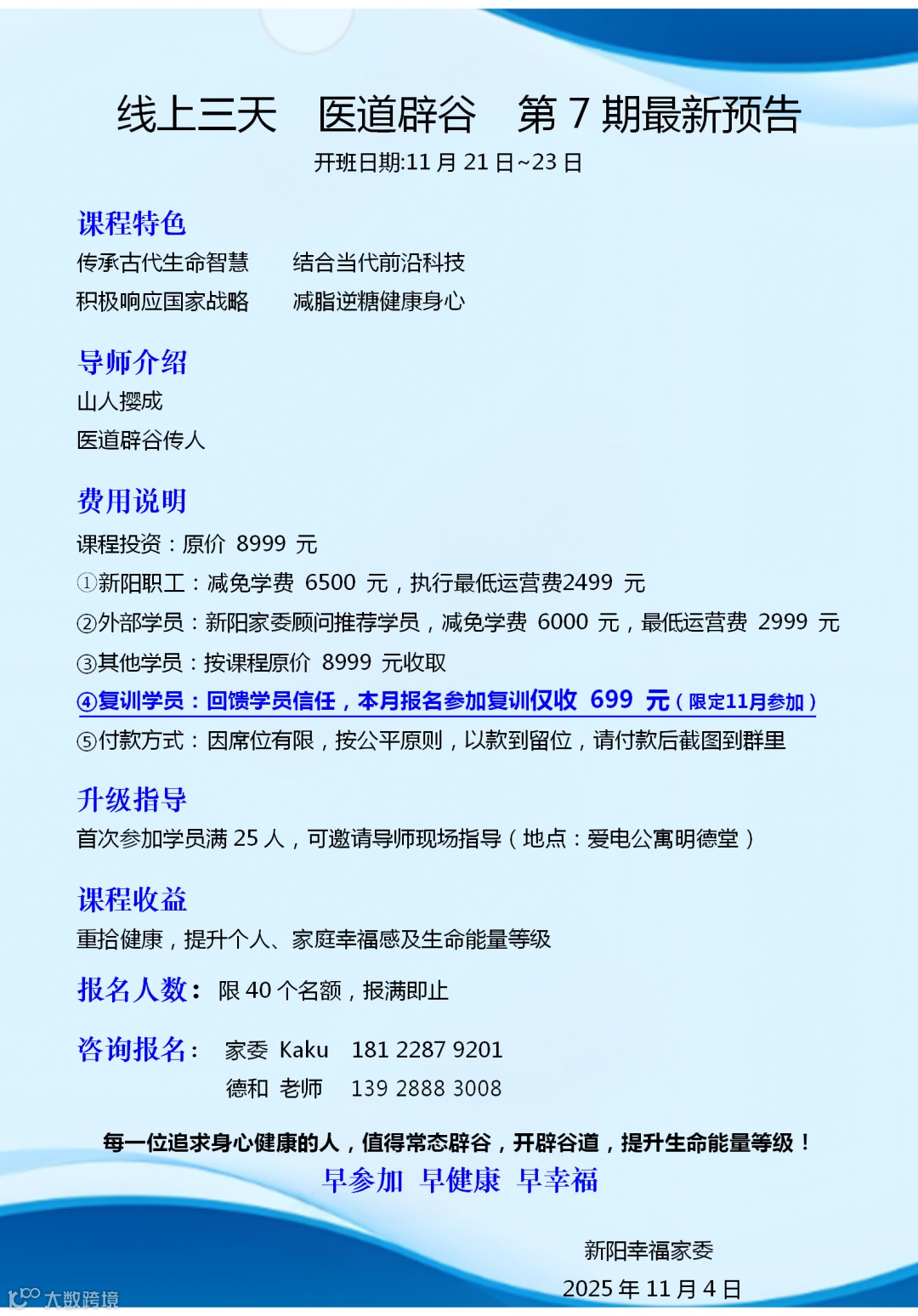 2025年,集团全面推动愛文化践行,敬畏生命,健康为本,恰逢 “体重健康管理年”,越来越多人开始留意体检报告上的数字、身体发出的信号。为助力更多人走在健康的大道上,集团幸福家委顾问郭建英总经理特别邀请医道辟谷传人撄成子老师为新阳家人及有需要的朋友开设安全、有效的“医道辟谷实修班”,第七期开始接受报名,欢迎有缘人一起探寻源自生命本源的力量,重拾健康自信的自己。