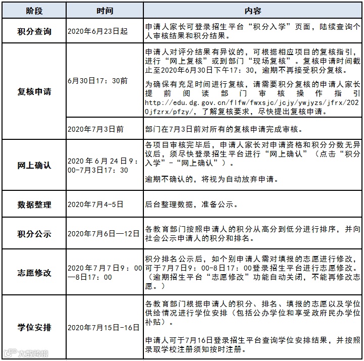 申请积分制入学的家长看过来!积分审核工作基本完成,各积分项目的审核结果将于6月23日起在“东莞市义务教育阶段学校统一招生平台”(简称“招生平台”)陆续公布,现将后续工作安排通知如下,一起来看看吧~