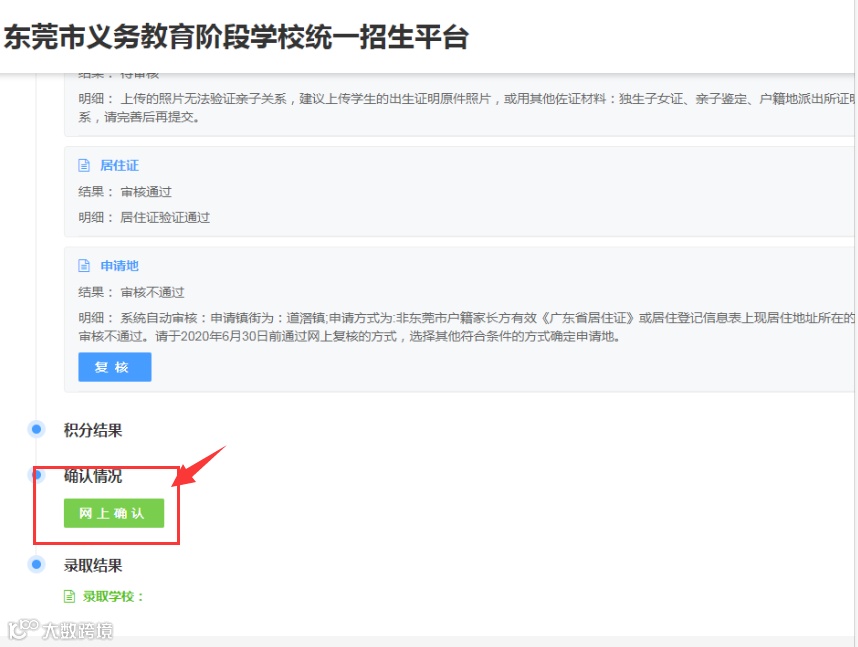 3.“居住证有效性、亲子关系、学籍、申请地”等资格项目是申请积分制入学的前提条件,如这些资格项目审核不通过,证明申请人不符合积分制入学资格,不能“网上确认”。