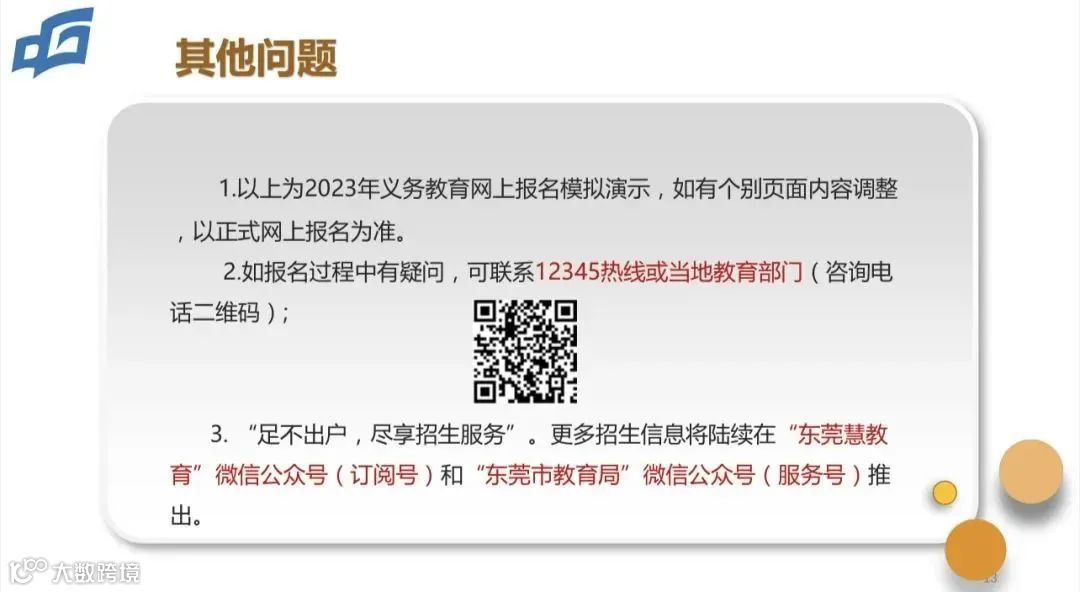 6. 网上报名期间有疑问或遇到困难,请及时联系12345政府热线、各镇街(园区)教育部门(扫二维码获取咨询电话)或就读学校。