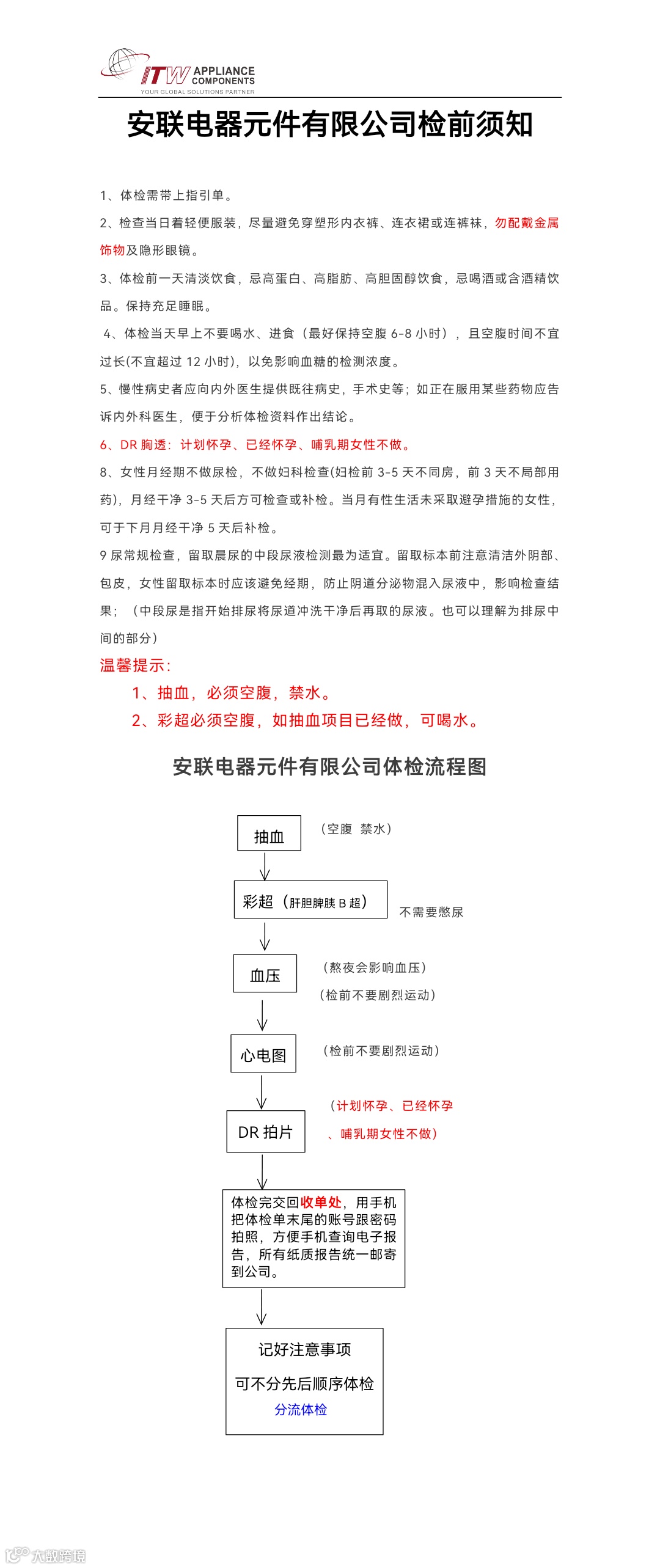 公司组织全体生产部员工及各部门间接人员在公司内进行健康体检。相关的体检安排如下: