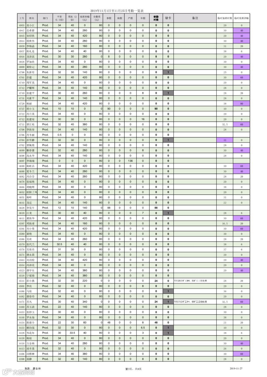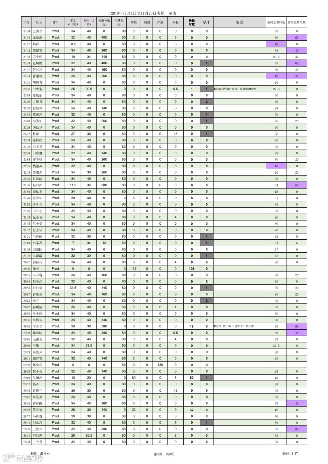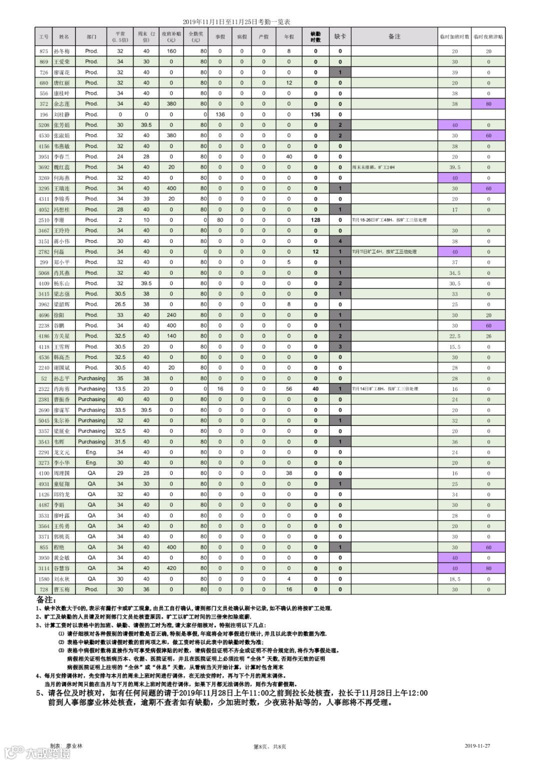 以下为2019年11月1日至11月25日出勤统计,请各位认真核对。