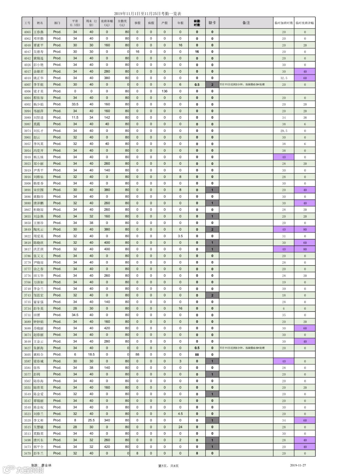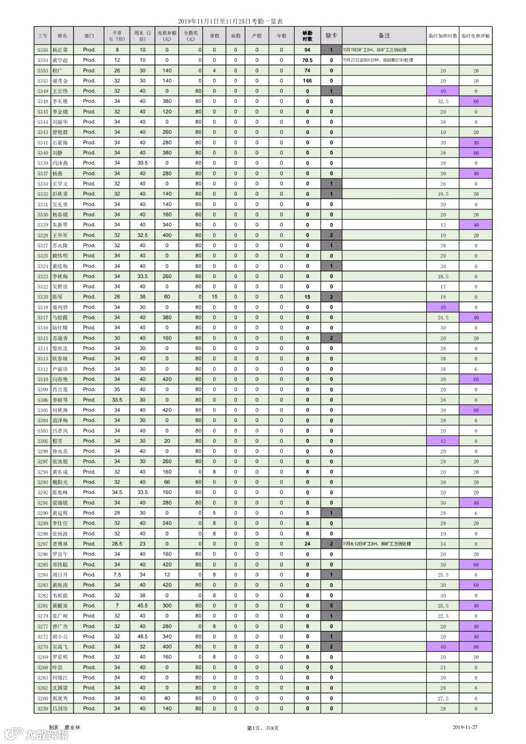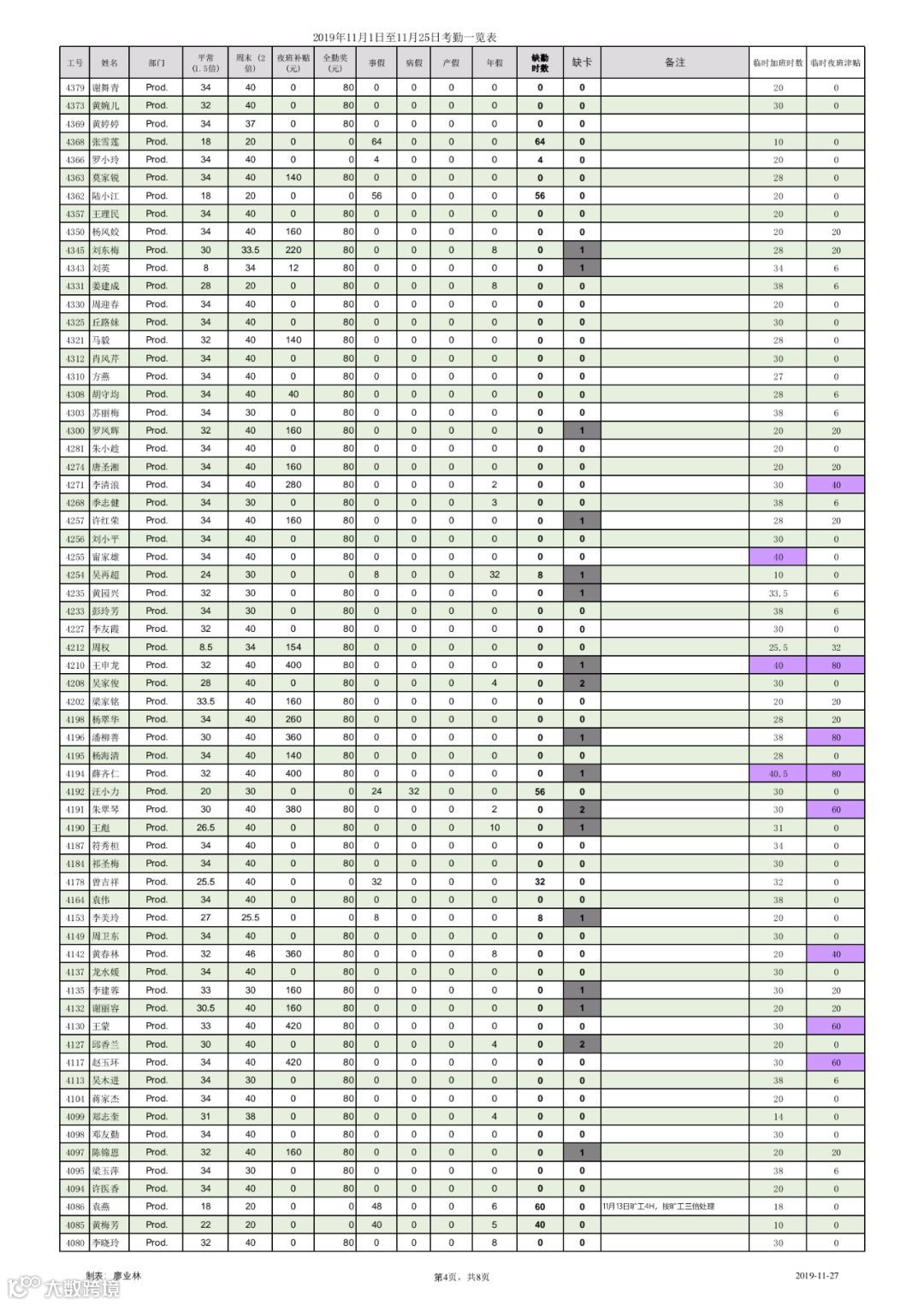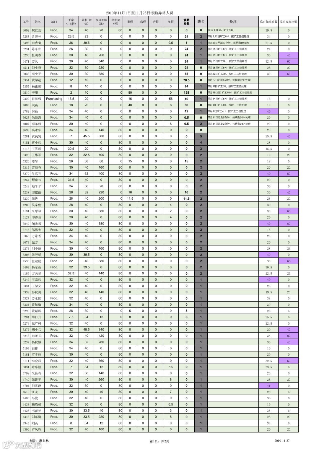 以下为2019年11月1日至11月25日出勤统计,请各位认真核对。
