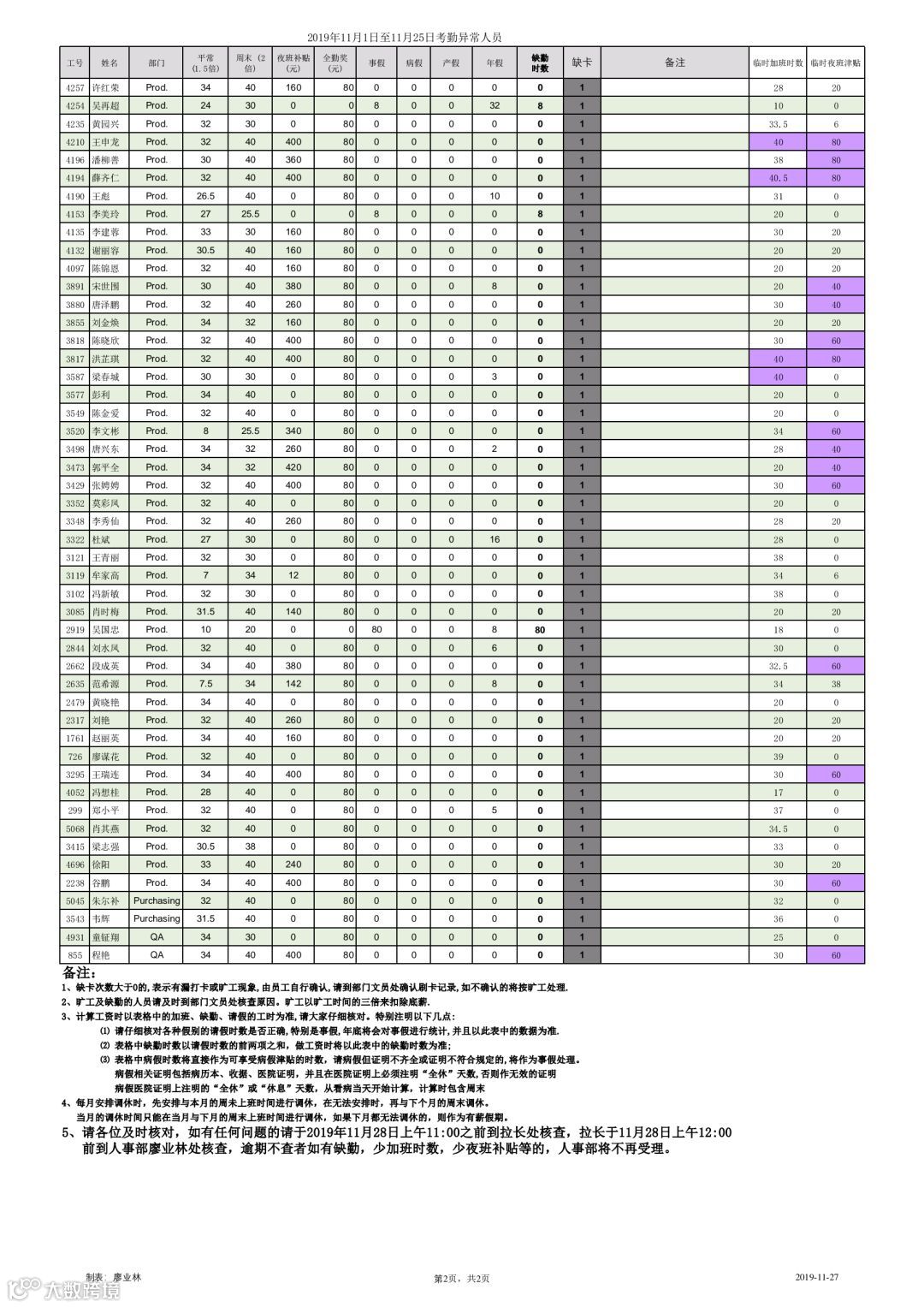 找拉长核对异常工时,拉长于11月28日上午12:00前到人事部廖业林(Vikki Liao)处核查,逾期不查者如有缺勤,少加班时数,少夜班补贴等的,人事部将不再受理。