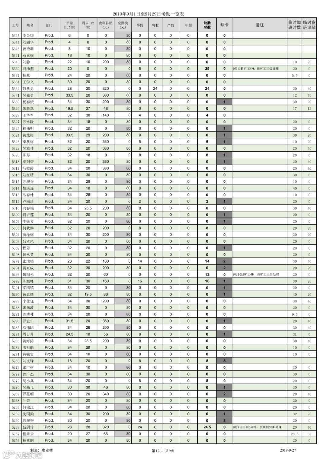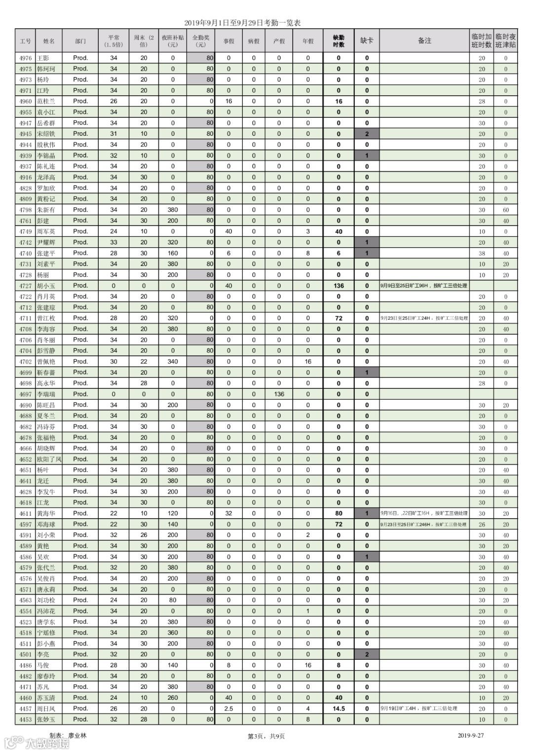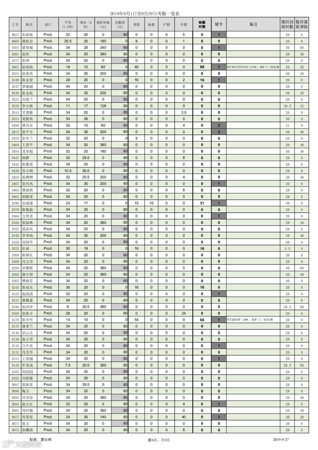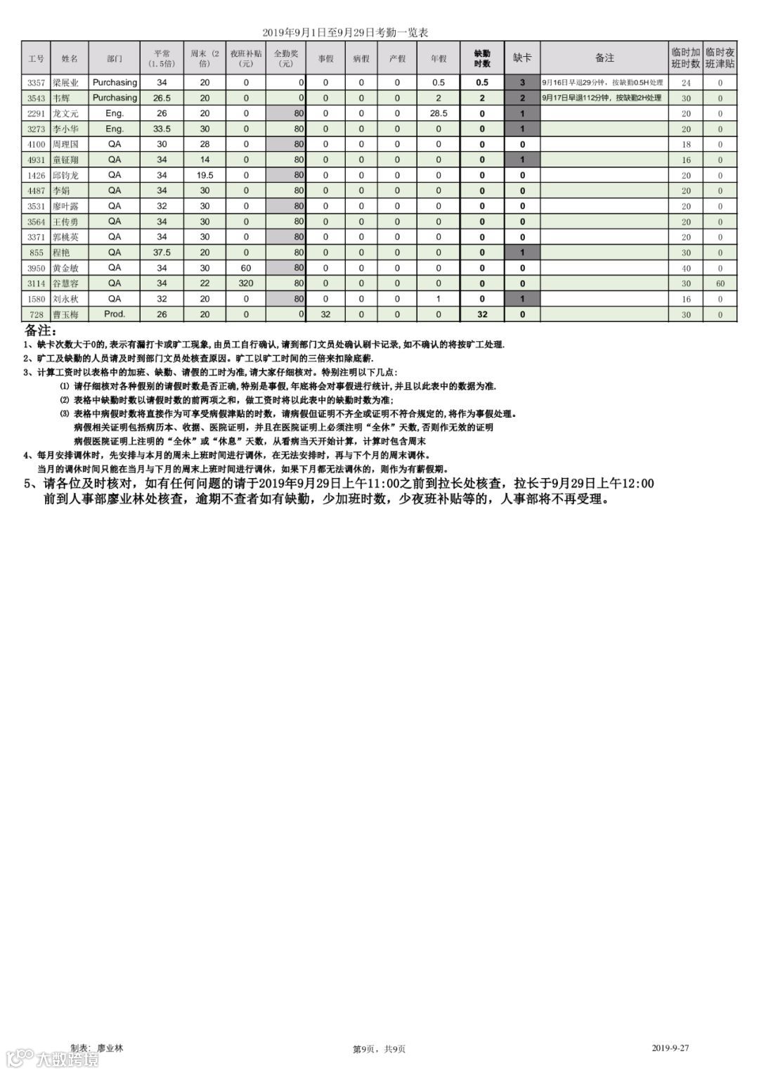 以下为2019年9月1日至9月25日出勤统计,请各位认真核对。