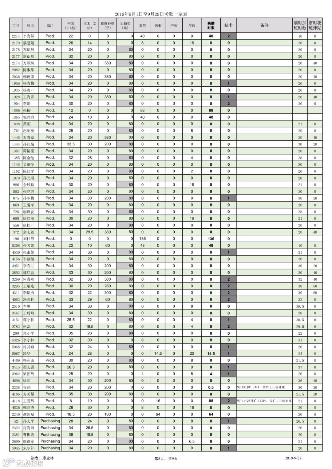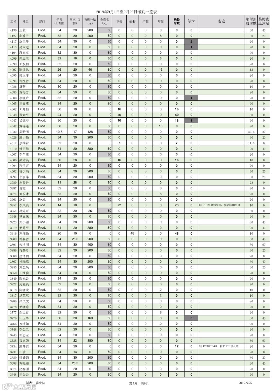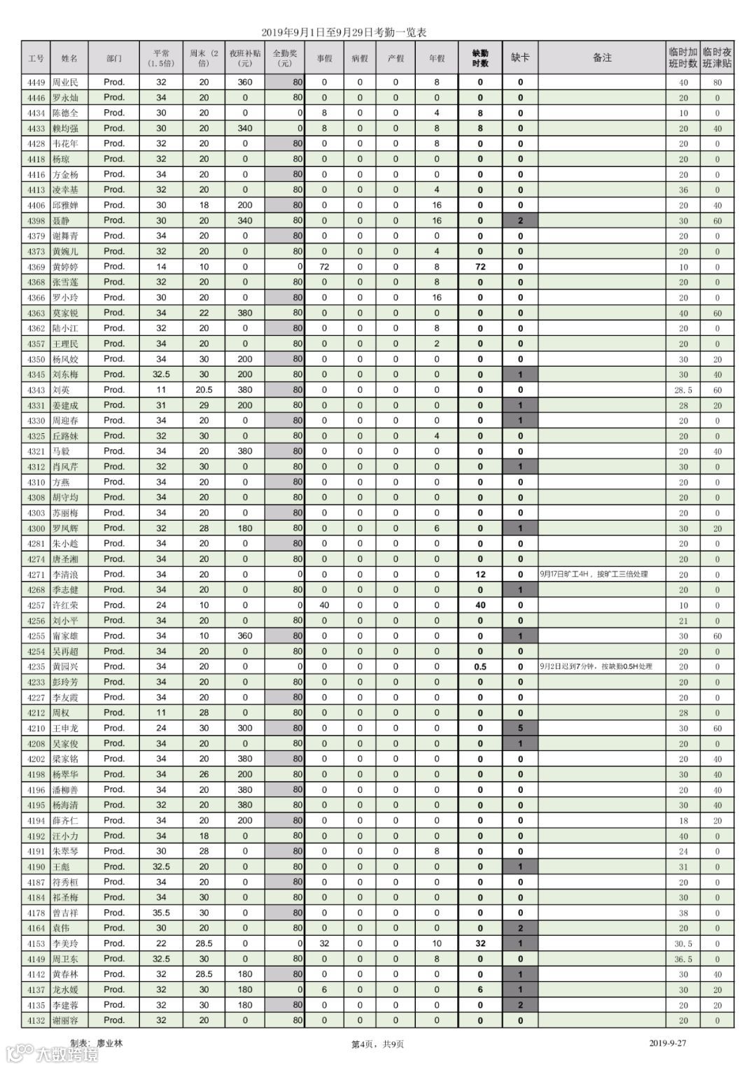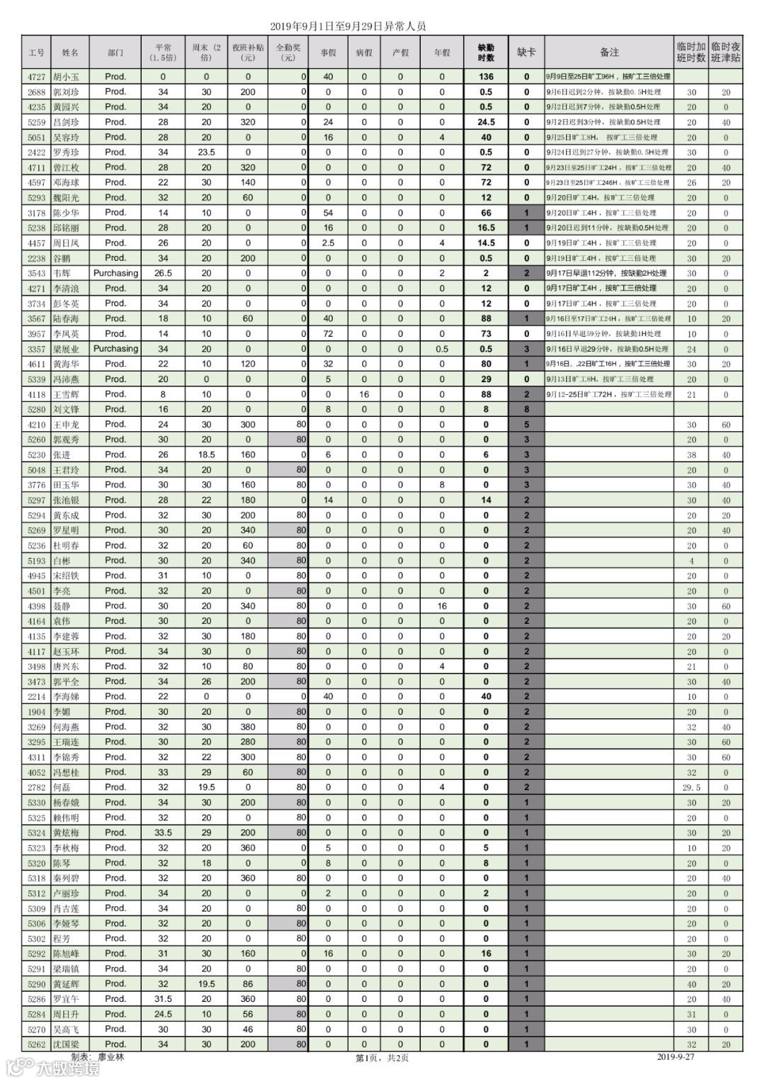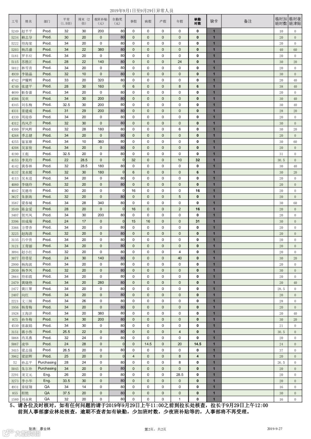 以下为2019年9月1日至9月25日出勤统计,请各位认真核对。