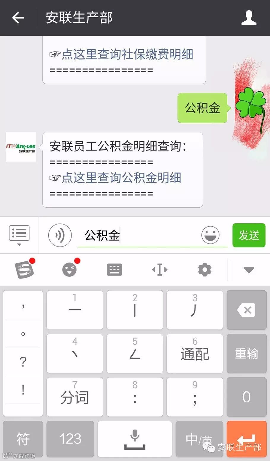 大家在“安联生产部”微信平台回复关键字“公积金”,即可快速获取查询信息,如果不知道自己公积金账号的,可向人事专员获取账号信息。