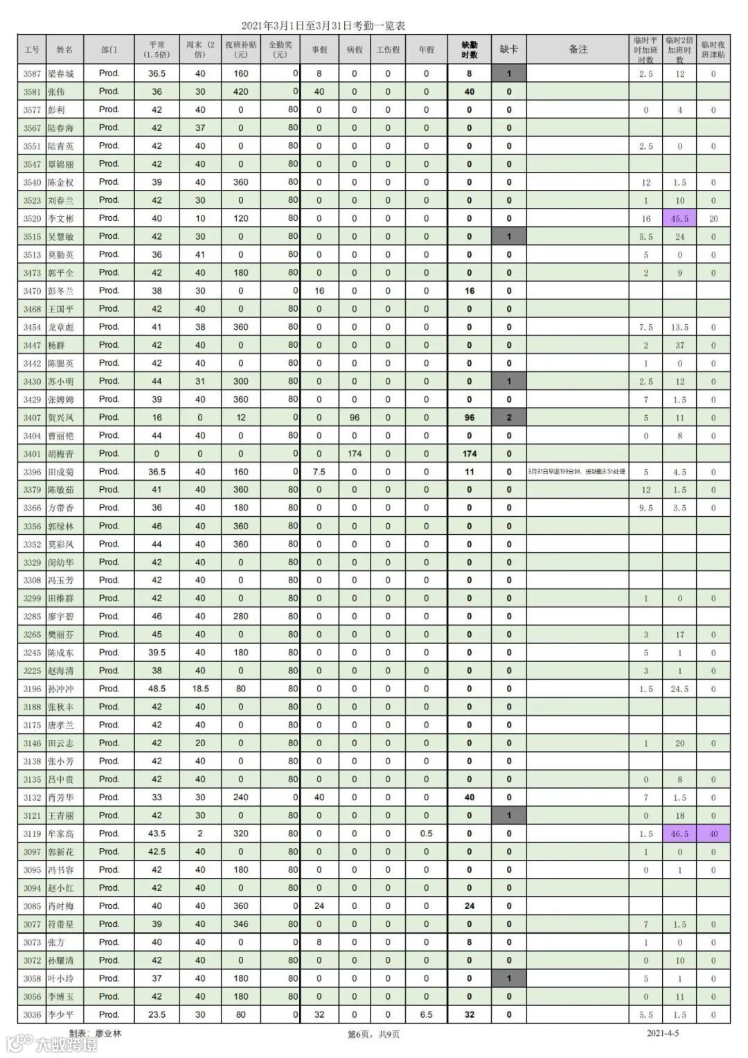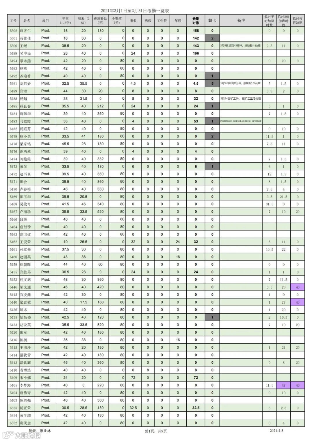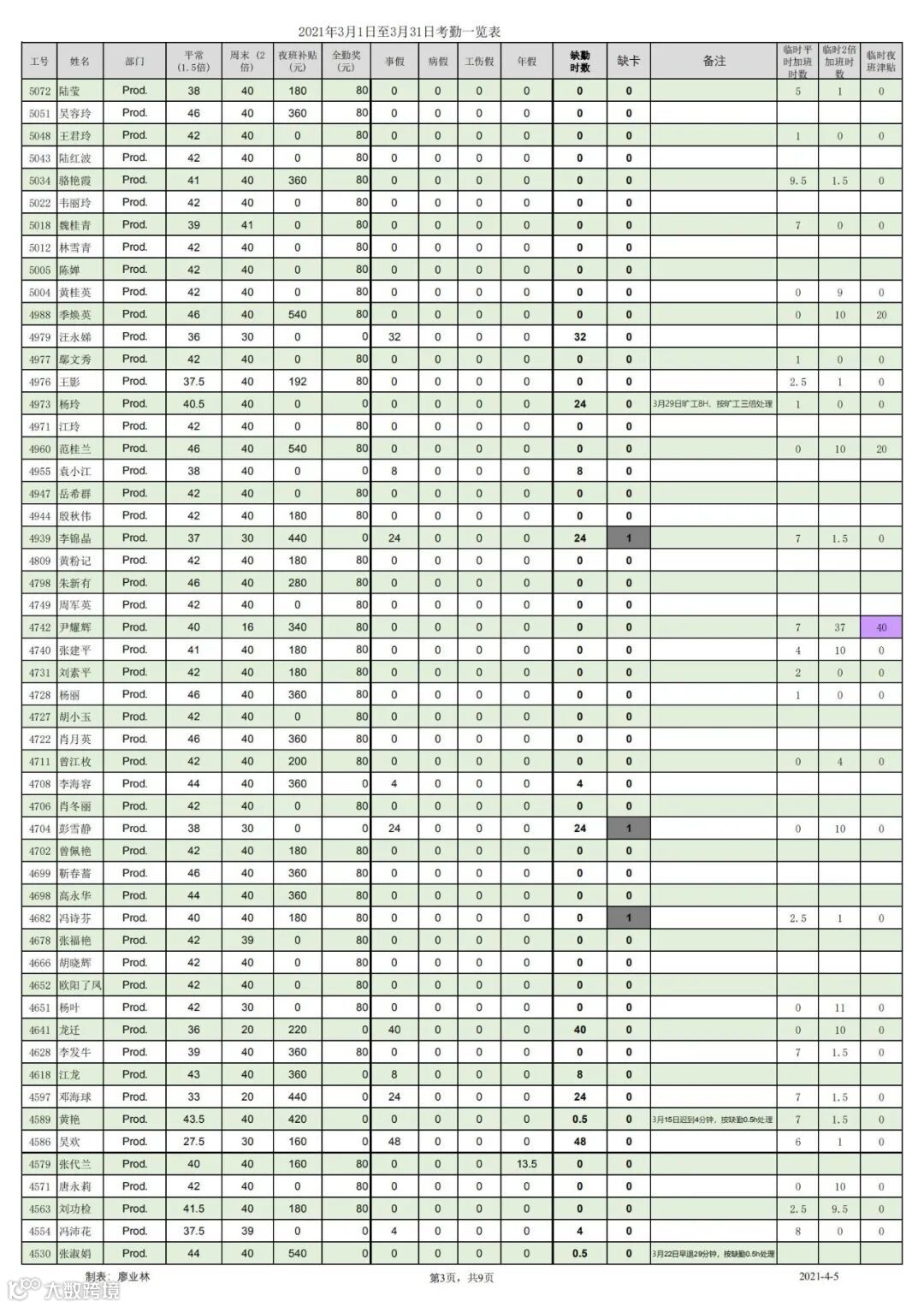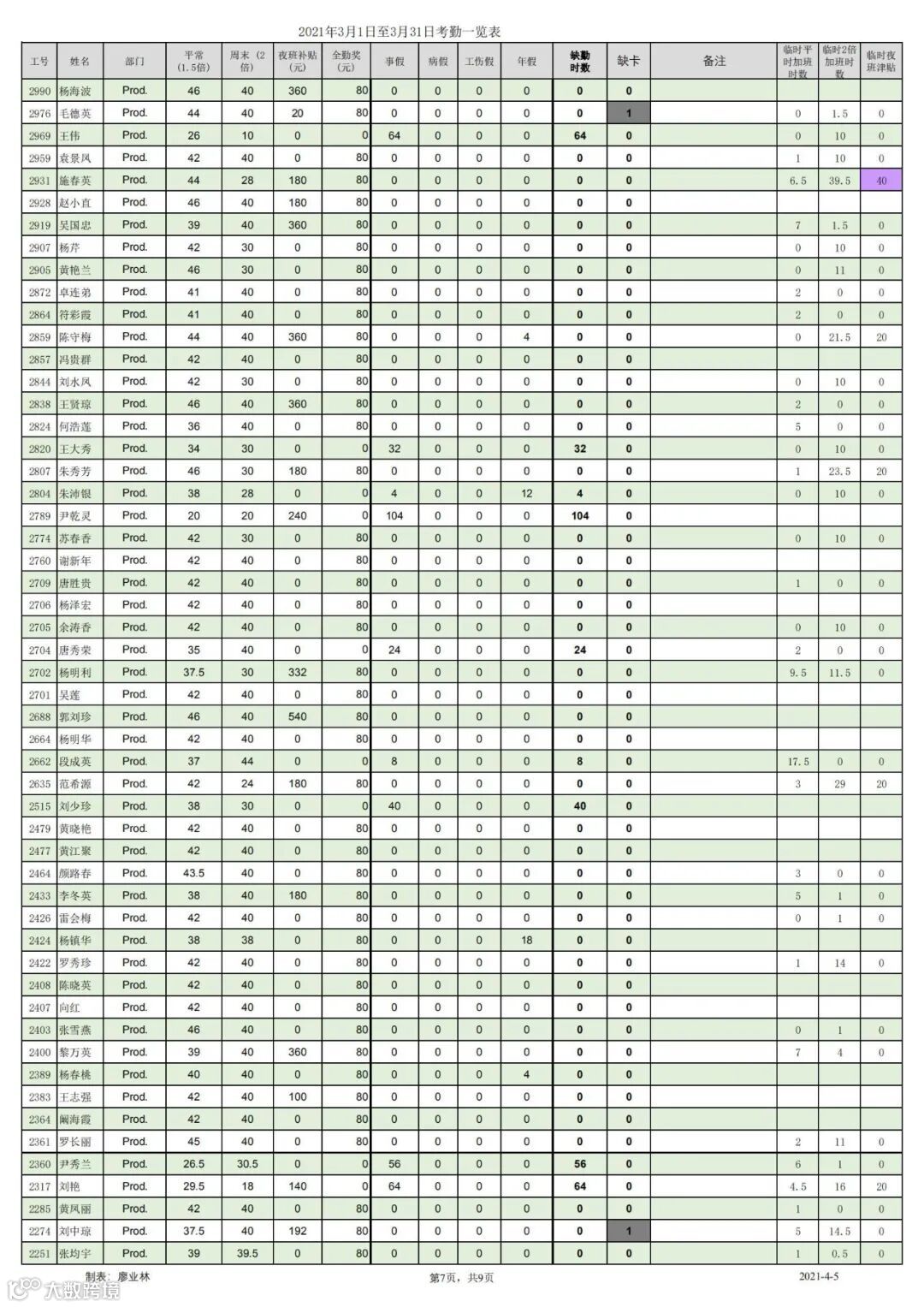 以下为2021年3月1日至3月31日出勤统计,请各位认真核对。