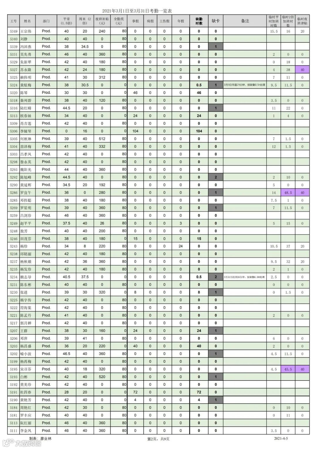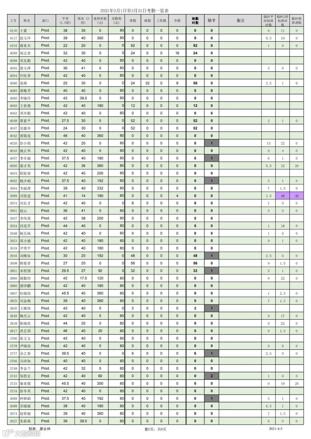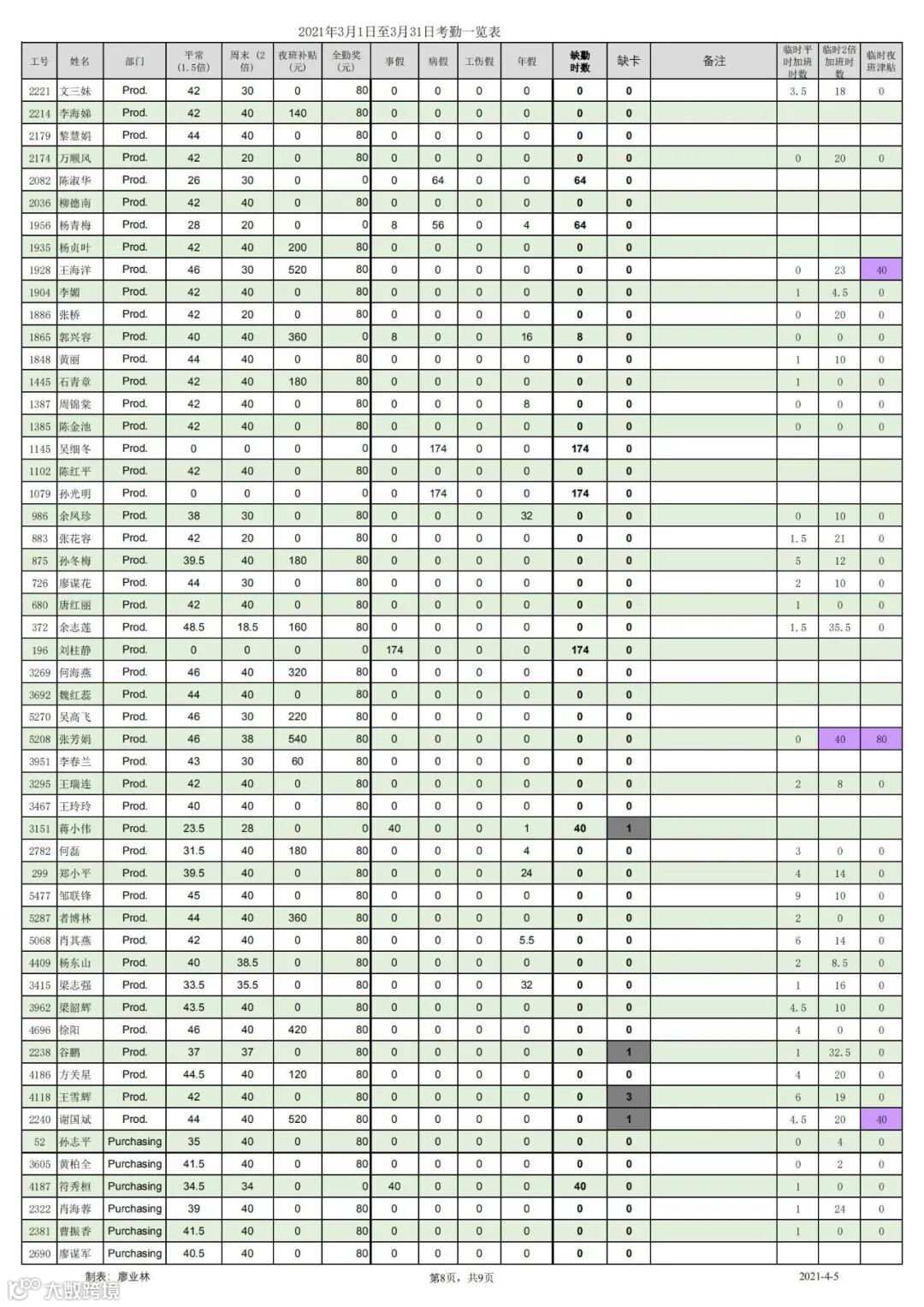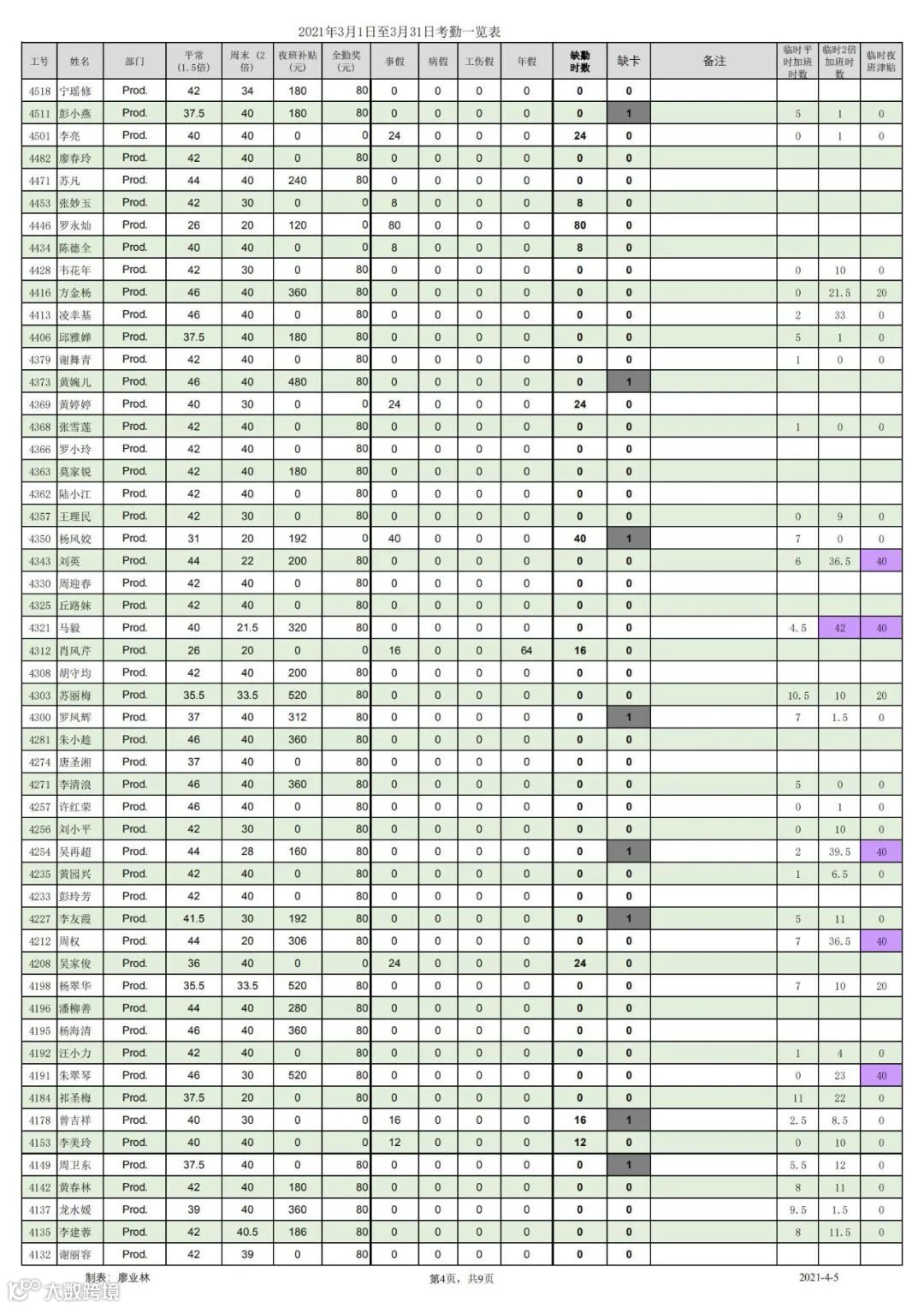 以下为2021年3月1日至3月31日出勤统计,请各位认真核对。