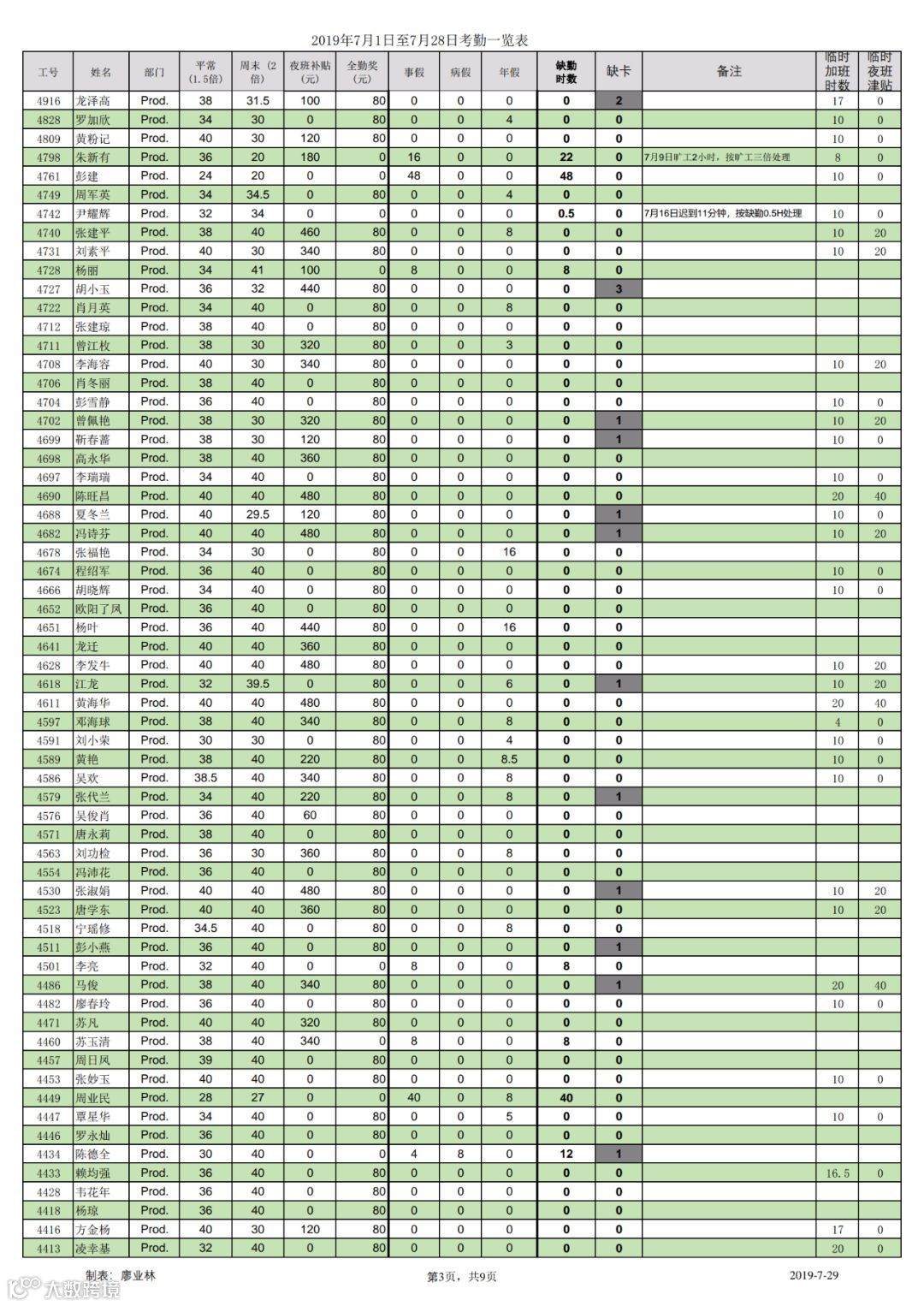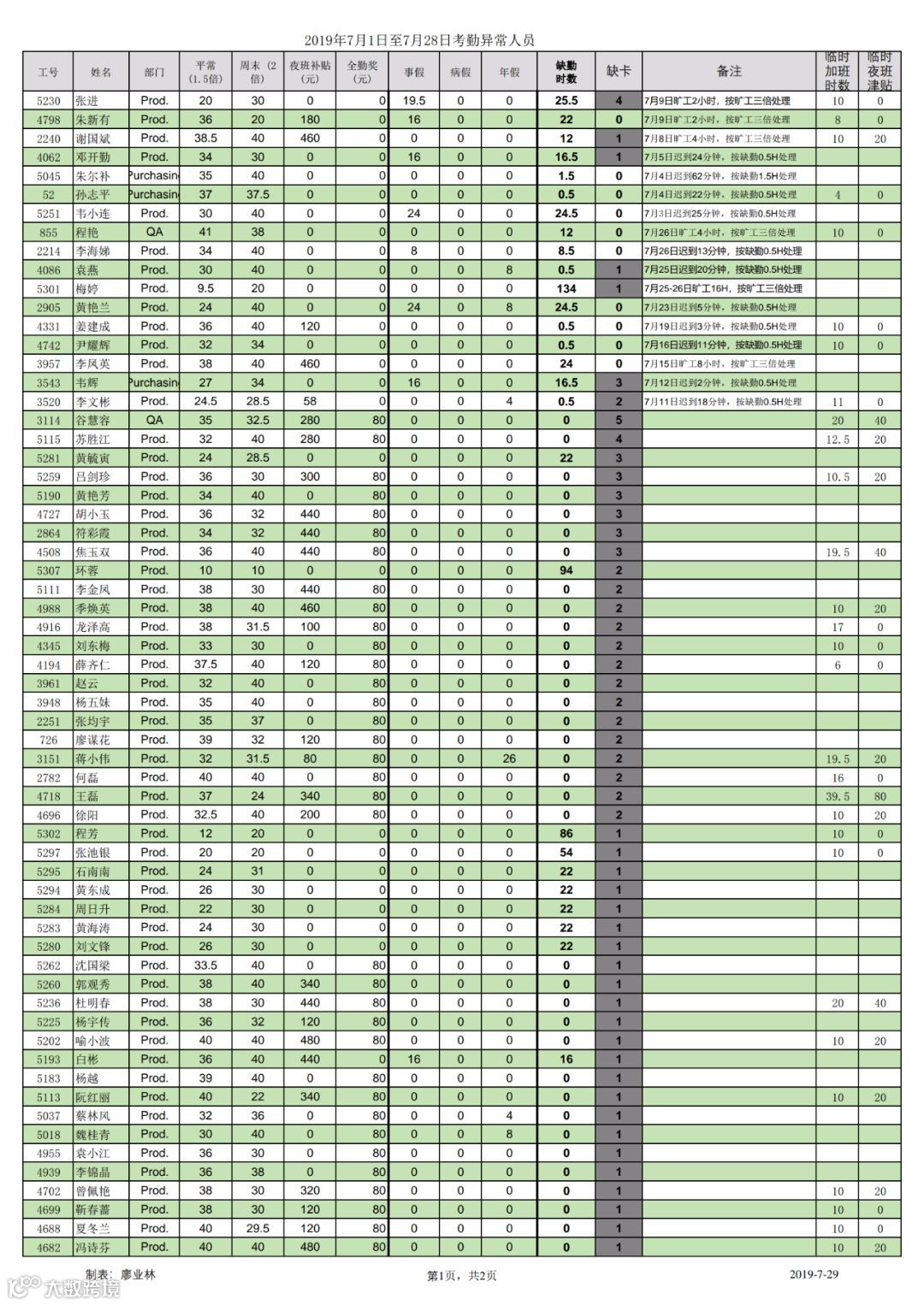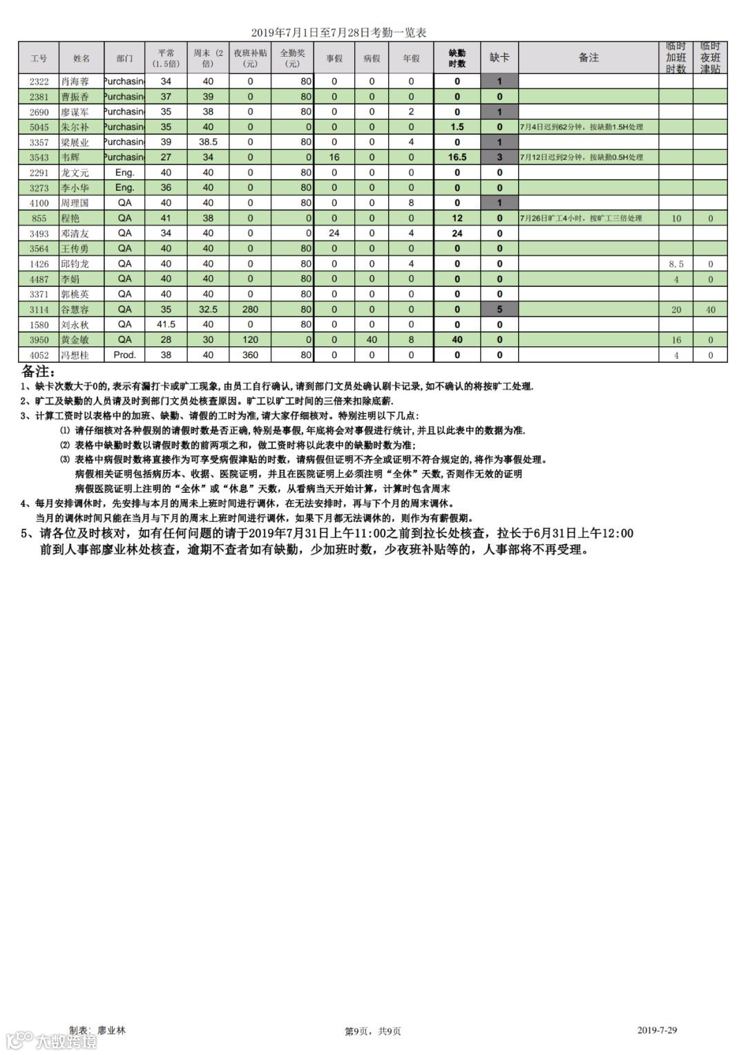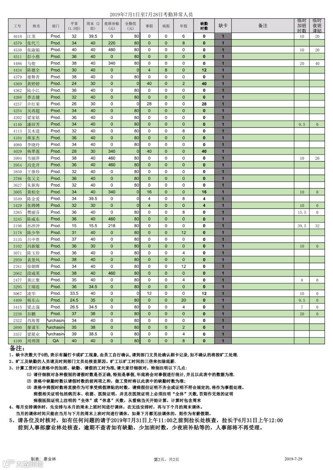以下为2019年7月1日至7月28日出勤统计,请各位认真核对。在7月31日上午11点之前找拉长核对异常工时,拉长于7月31日上午12:00前到人事部廖业林(Vikki Liao)处核查,逾期不查者如有缺勤,少加班时数,少夜班补贴等的,人事部将不再受理。
