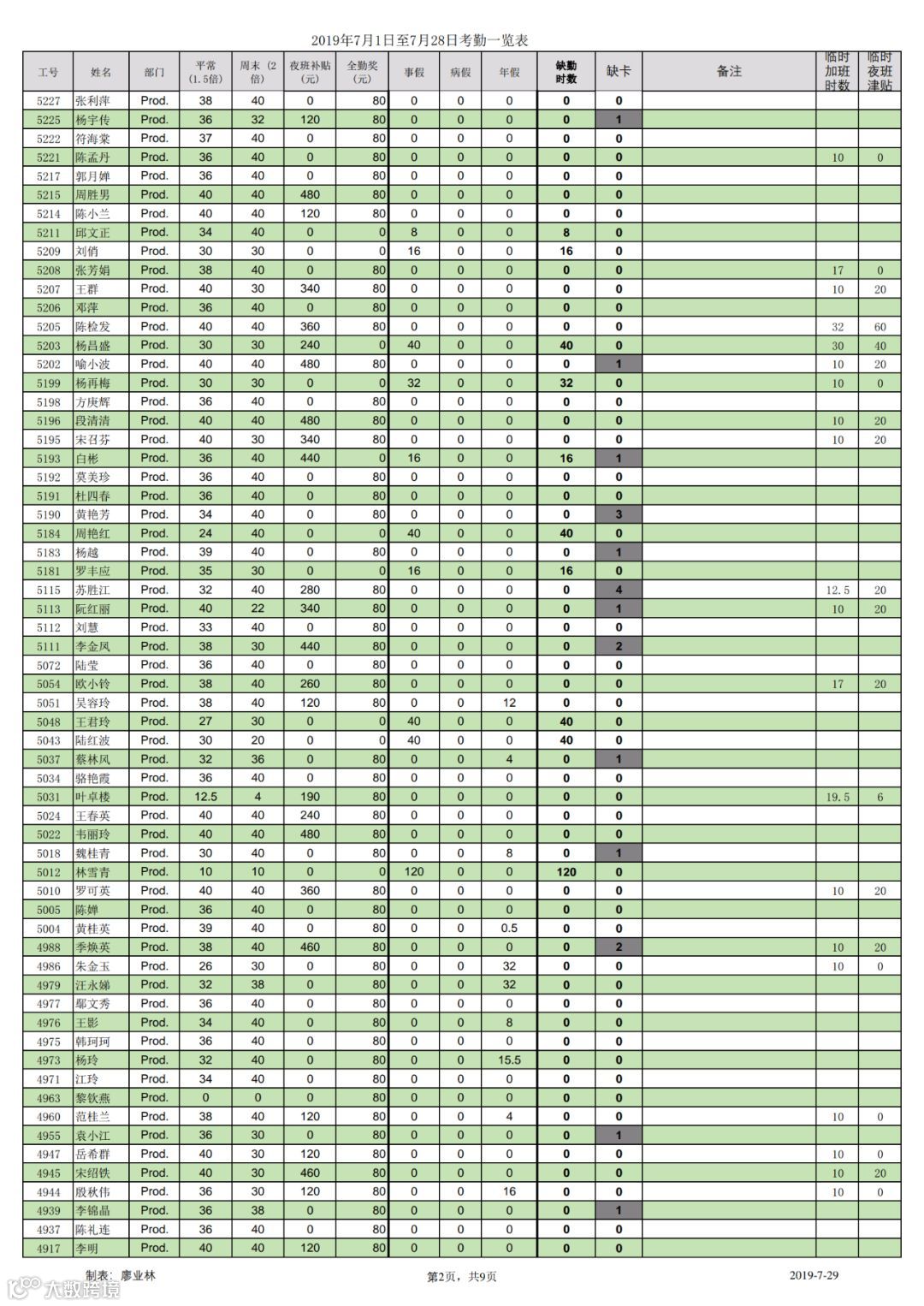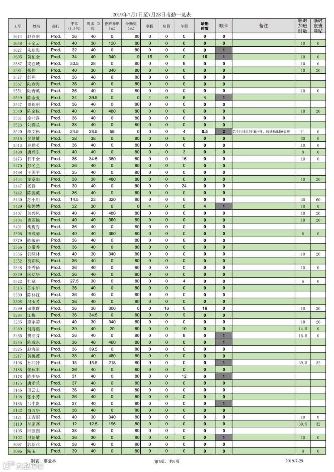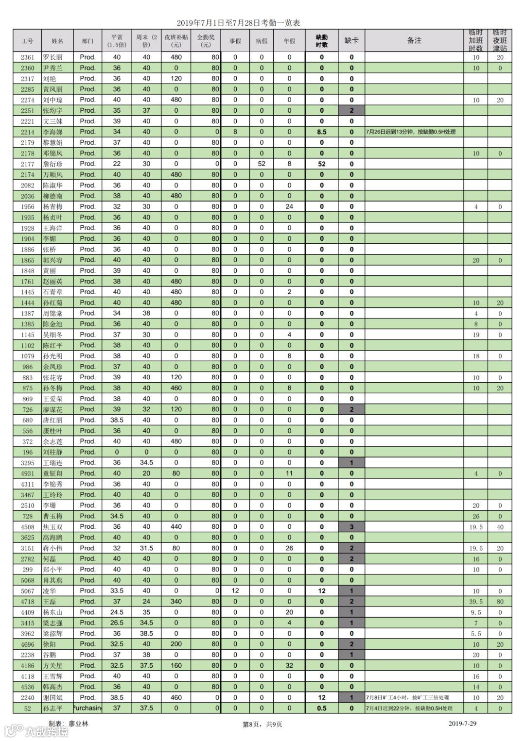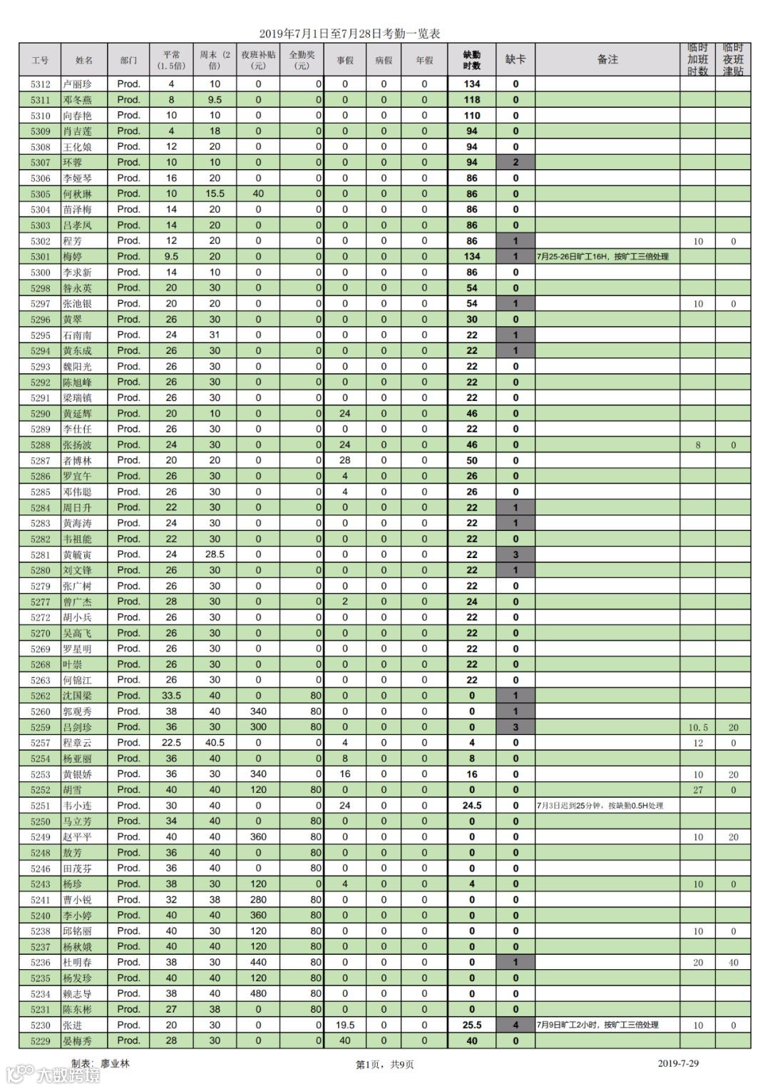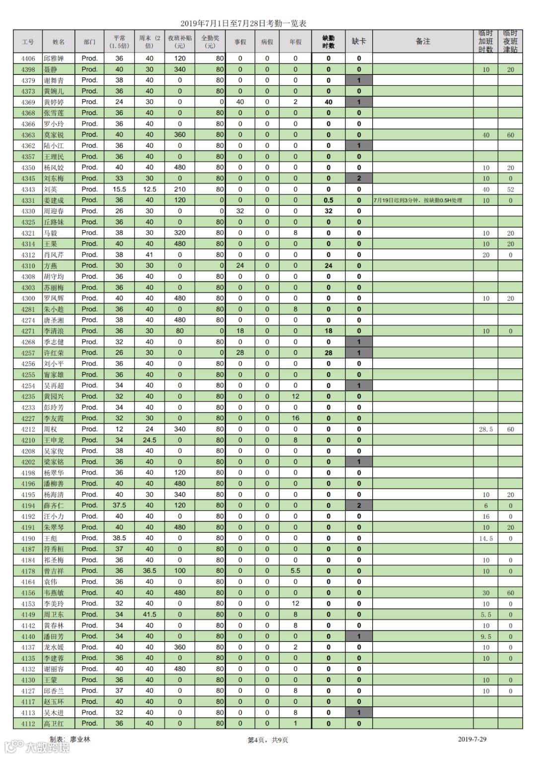 以下为2019年7月1日至7月28日出勤统计,请各位认真核对。在7月31日上午11点之前找拉长核对异常工时,拉长于7月31日上午12:00前到人事部廖业林(Vikki Liao)处核查,逾期不查者如有缺勤,少加班时数,少夜班补贴等的,人事部将不再受理。