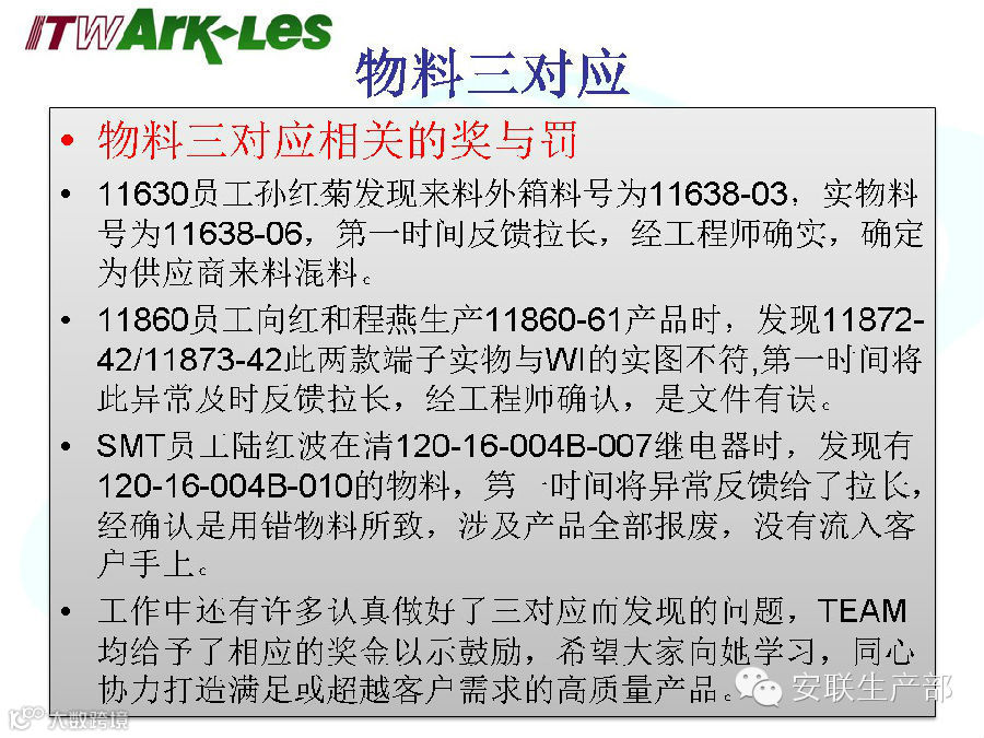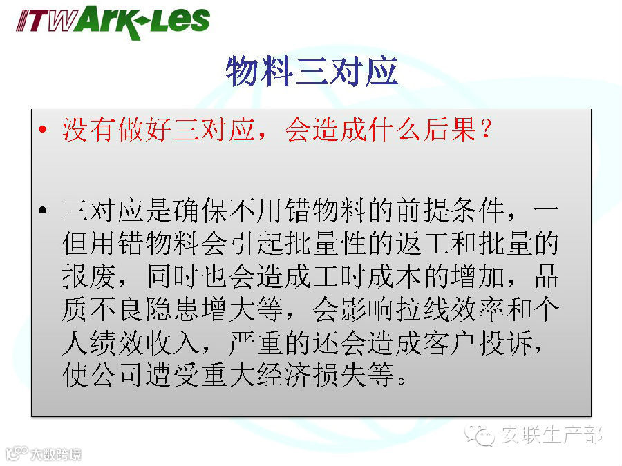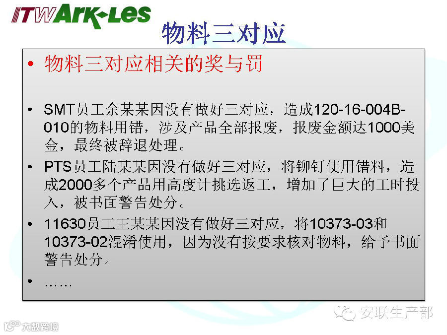 物料三对应是我们保证品质最基本的一项要求,员工入职培训、拉线上岗岗位培训、培训跟踪表上都有三对应方面明确而重要的要求,我们的每一个员工都非常的清楚不做物料三对应会造成什么样的后果和影响。
