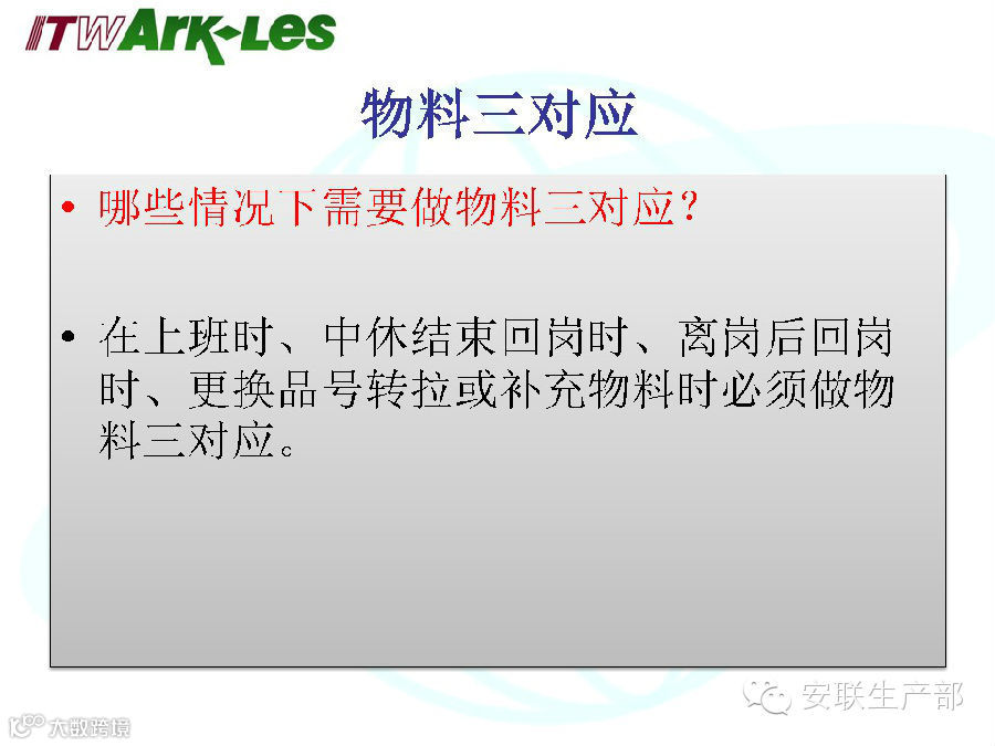 在上班时、中休结束时、离岗后回岗时、更换品号转拉或补充物料时必须做物料三对应。