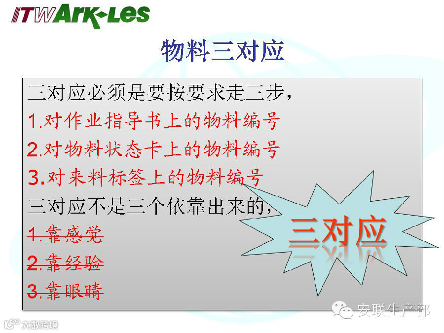 物料三对应是指在上岗操作时要检查“作业指导书上的物料编号”、“物料状态卡上的物料编号”、“来料标签上的物料编号”是否一致,只有三者对应一致后才可以进行相关操作。