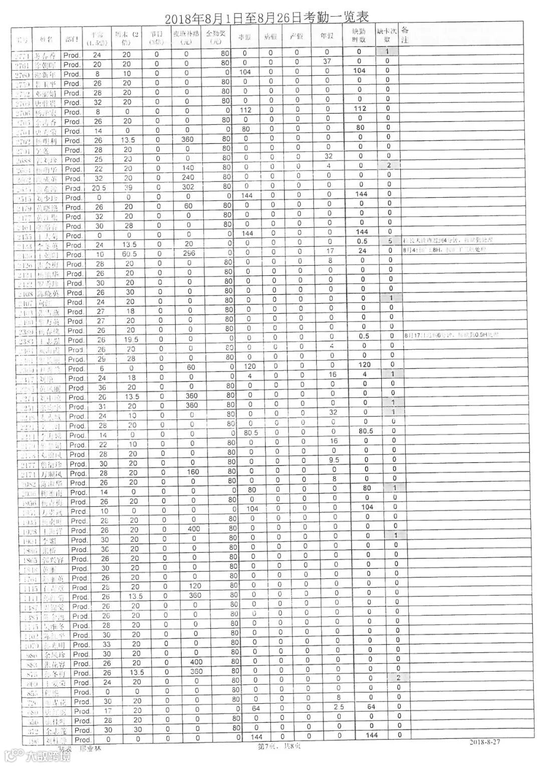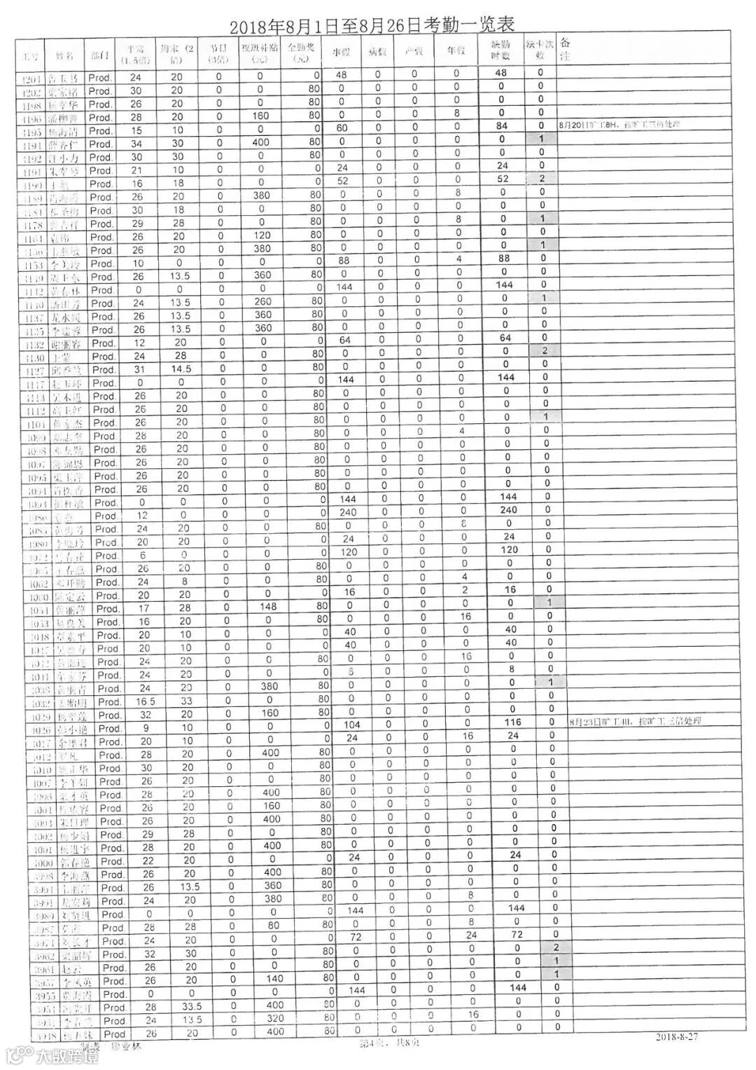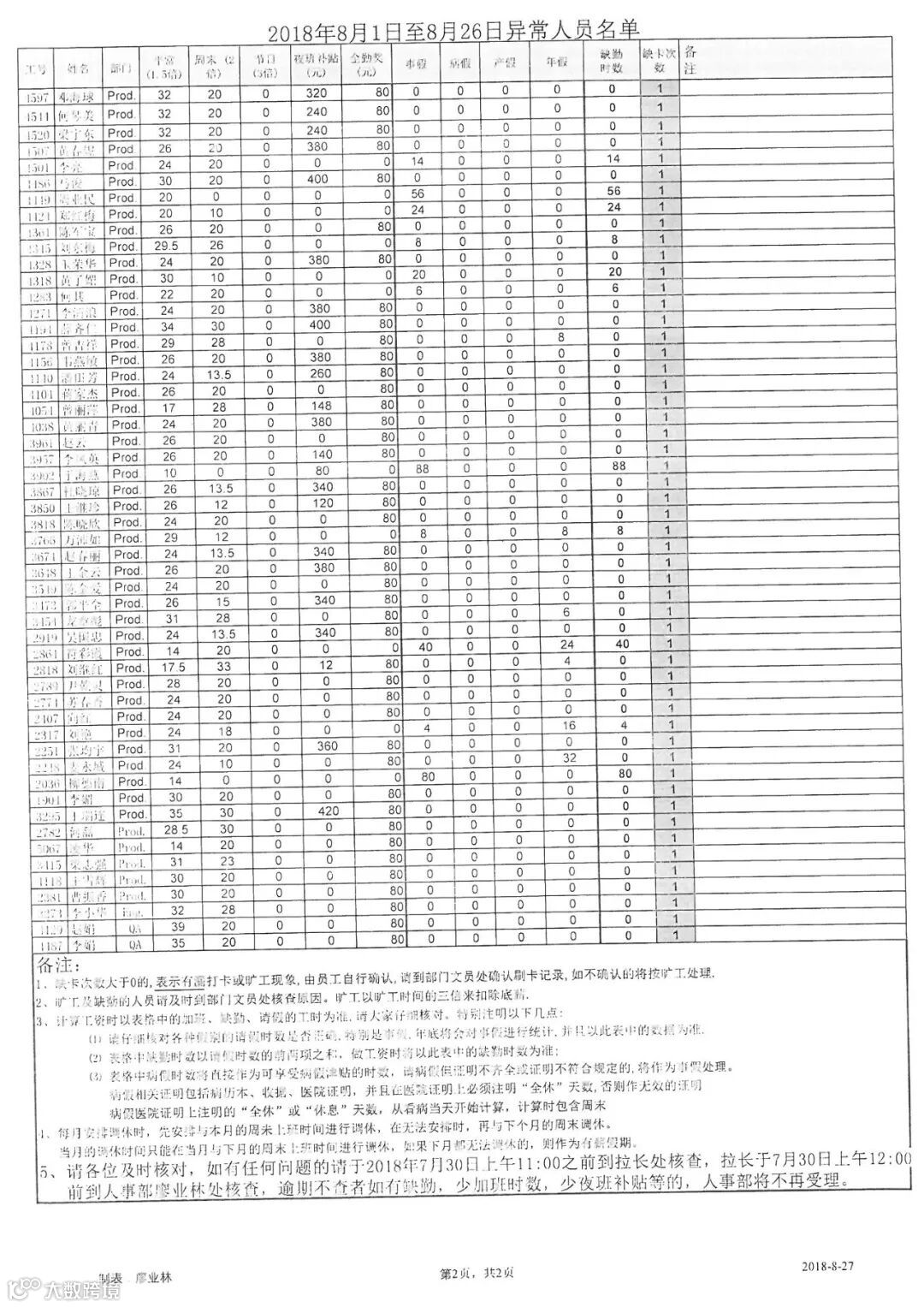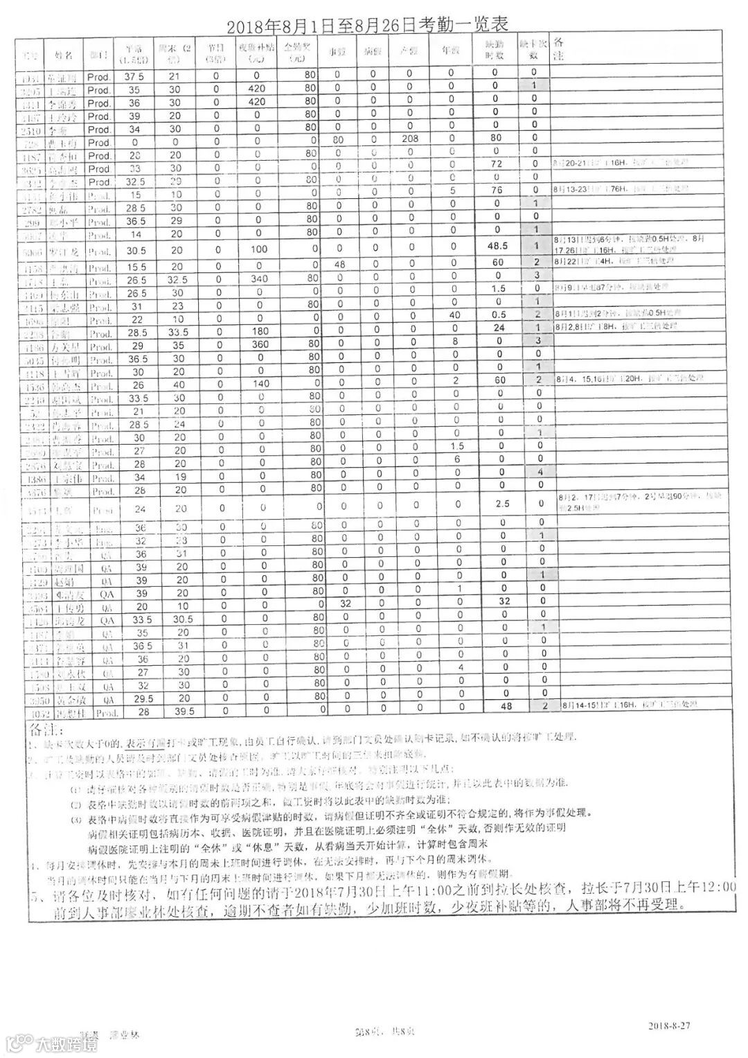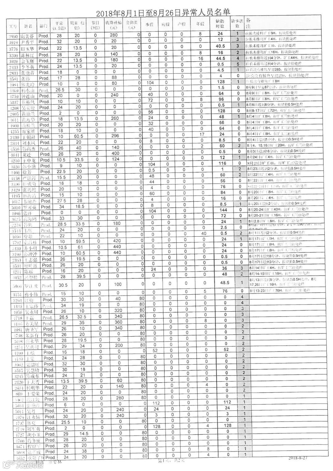 以下为2018年8月1日至8月26日出勤统计,请各位认真核对。在8月30日上午11点之前找拉长核对异常工时,拉长于8月30日上午12:00前到人事部廖业林(Vikki Liao)处核查,逾期不查者如有缺勤,少加班时数,少夜班补贴等的,人事部将不再受理。