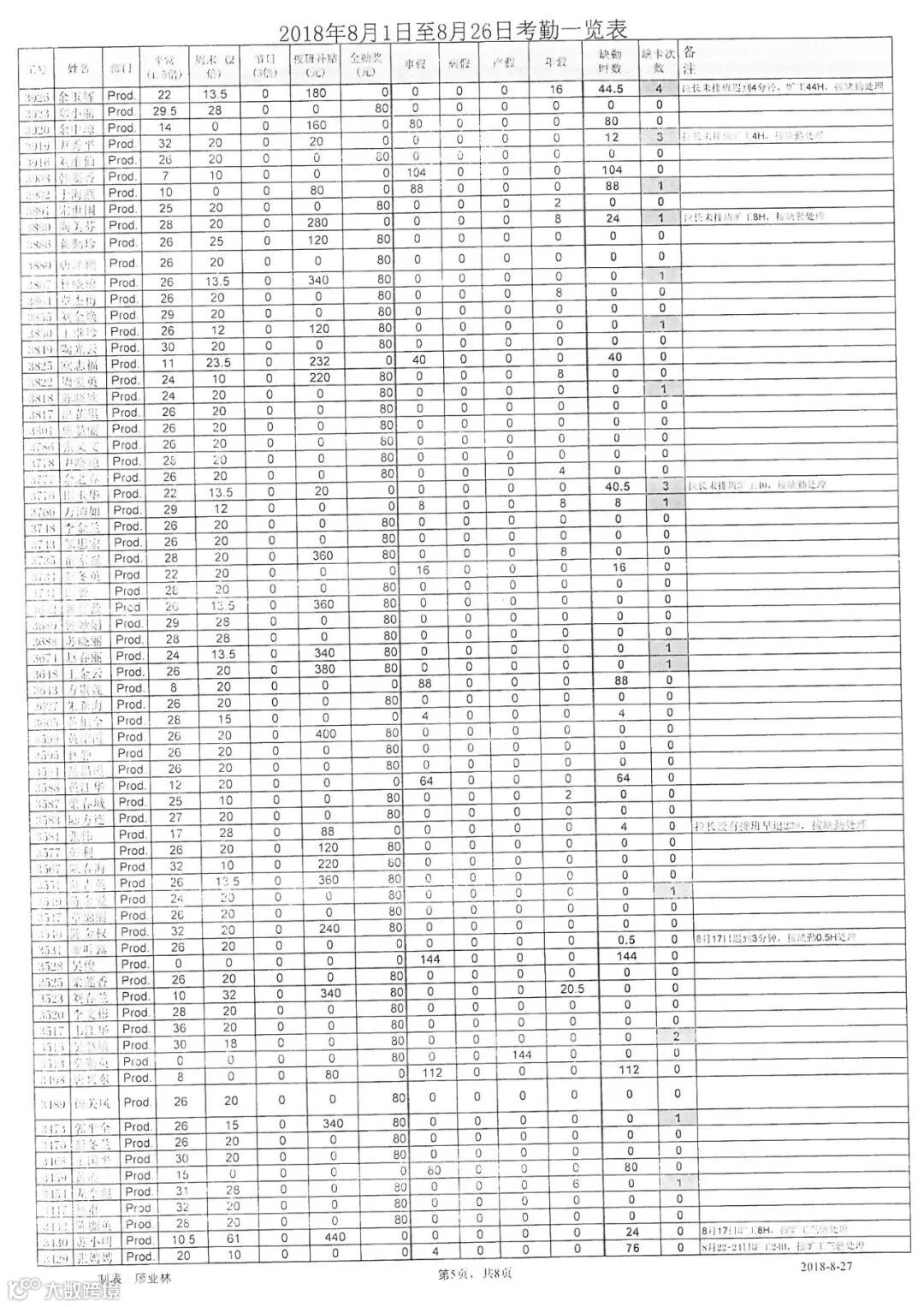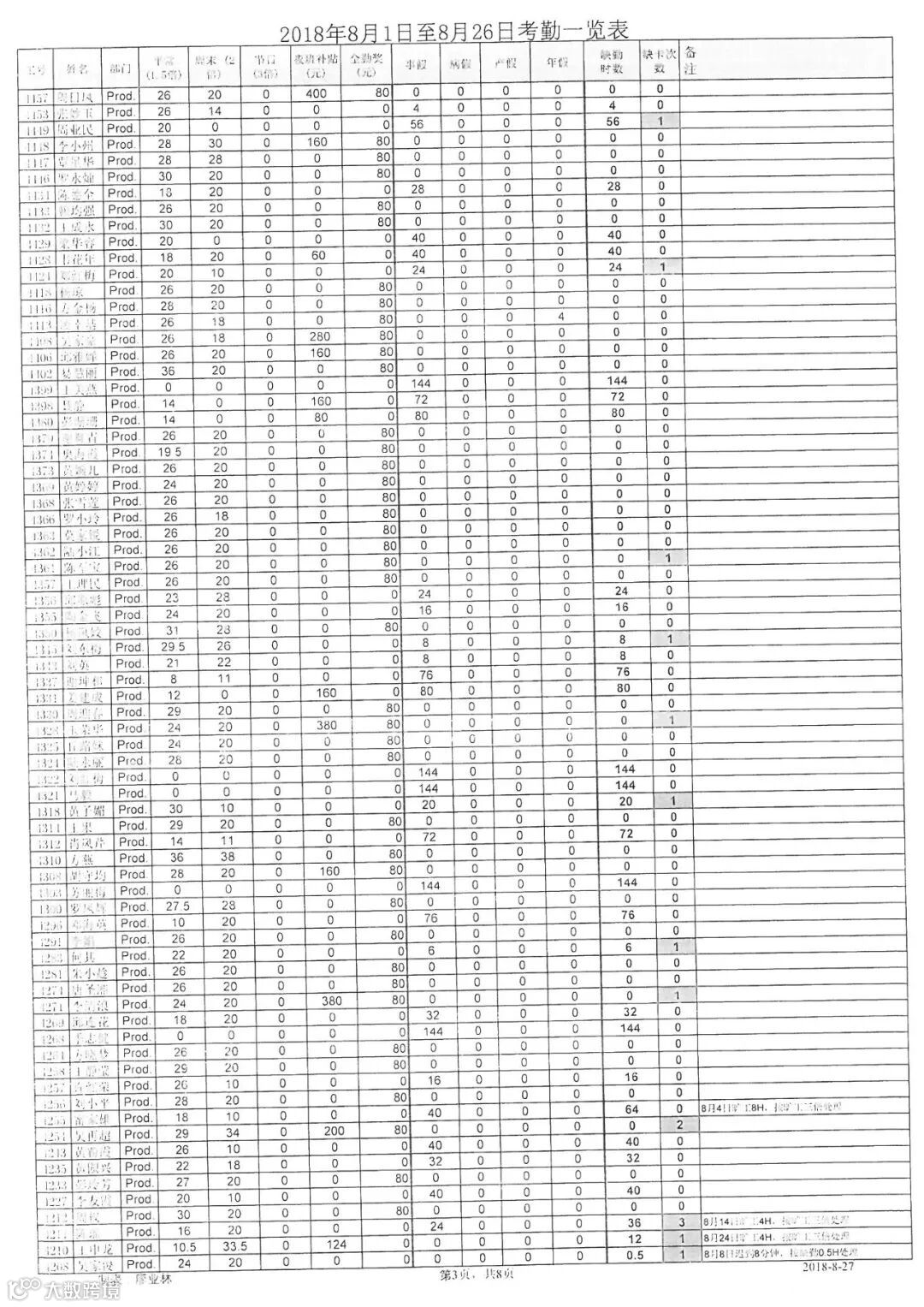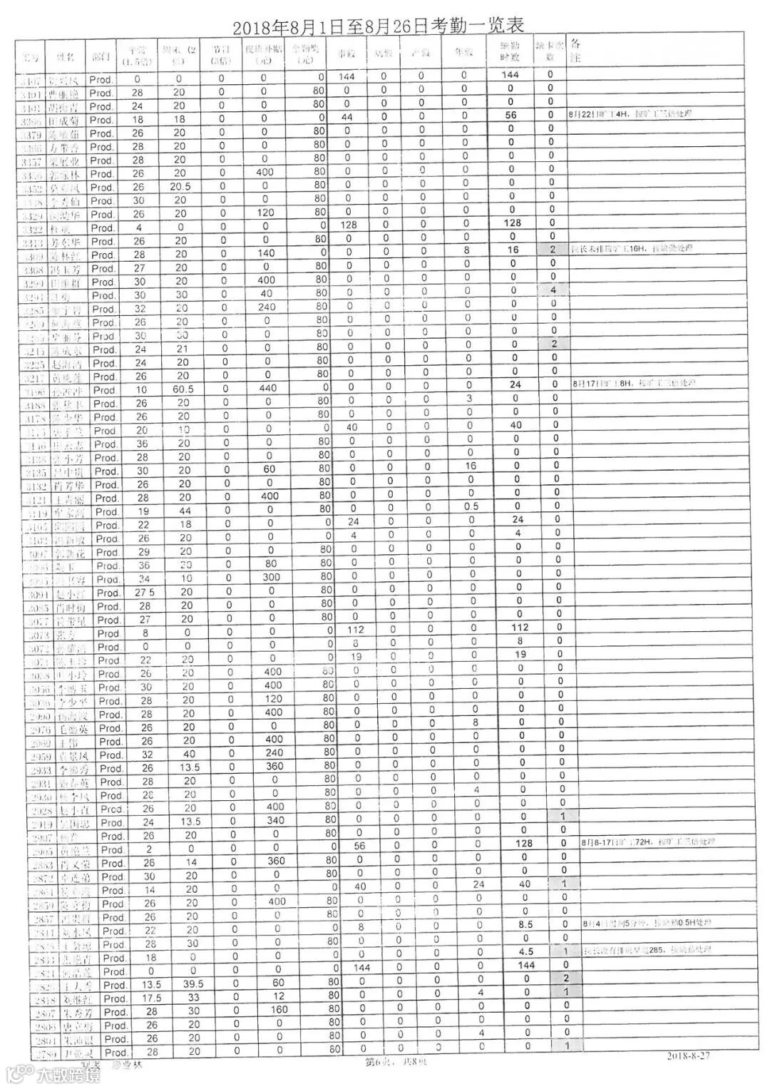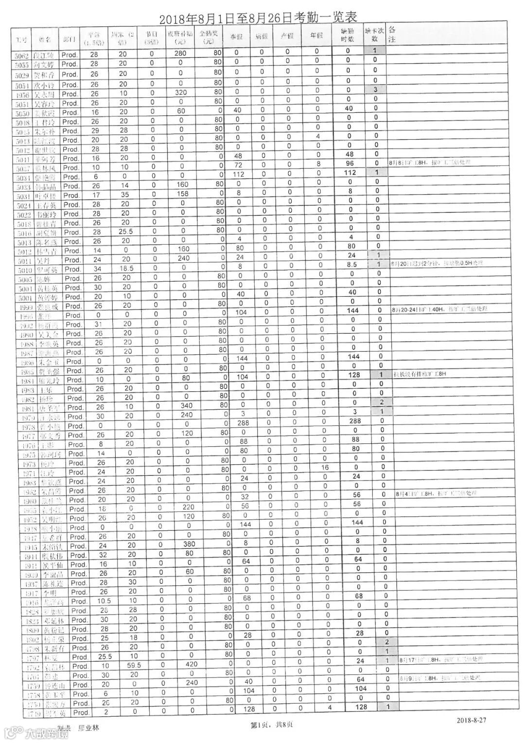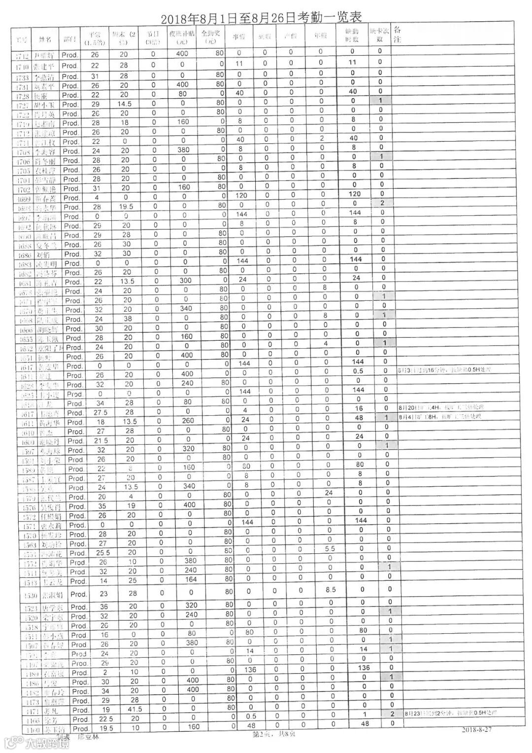以下为2018年8月1日至8月26日出勤统计,请各位认真核对。在8月30日上午11点之前找拉长核对异常工时,拉长于8月30日上午12:00前到人事部廖业林(Vikki Liao)处核查,逾期不查者如有缺勤,少加班时数,少夜班补贴等的,人事部将不再受理。