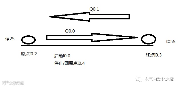 按下启动按钮,皮带带动工作台,前进到终点后停5秒,返回至原点停3秒
