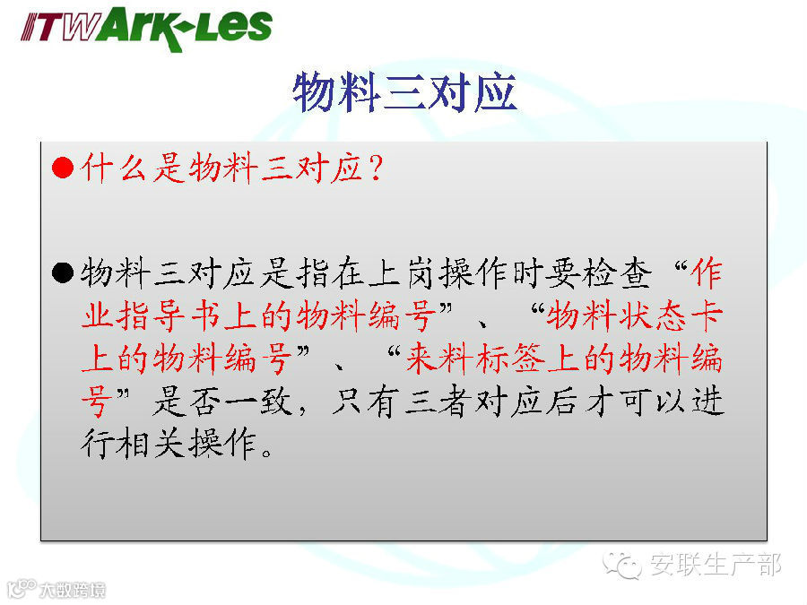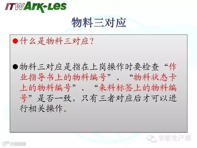 在上班时、中休结束时、离岗后回岗时、更换品号转拉或补充物料时必须做物料三对应。物料三对应是指在上岗操作时要检查“作业指导书上的物料编号”、“物料状态卡上的物料编号”、“来料标签上的物料编号”是否一致,只有三者对应一致后才可以进行相关操作。