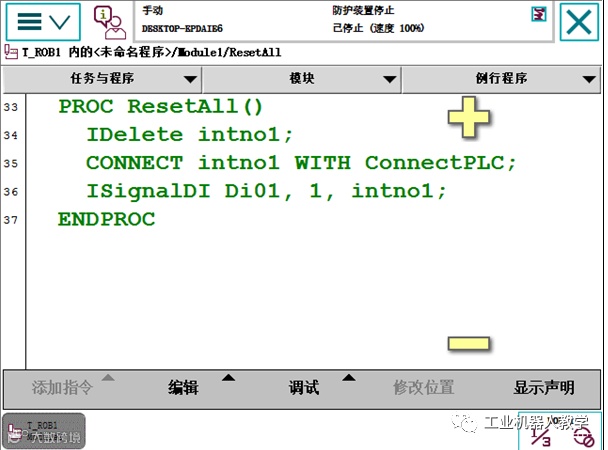 第二种用法就是通过中断关联一个信号。在工业机器人运行时,每当该信号触发的时候,就运行一次通信程序,进行数据的传输。适用于在需要特定条件下进行数据传输。示例程序下图所示。