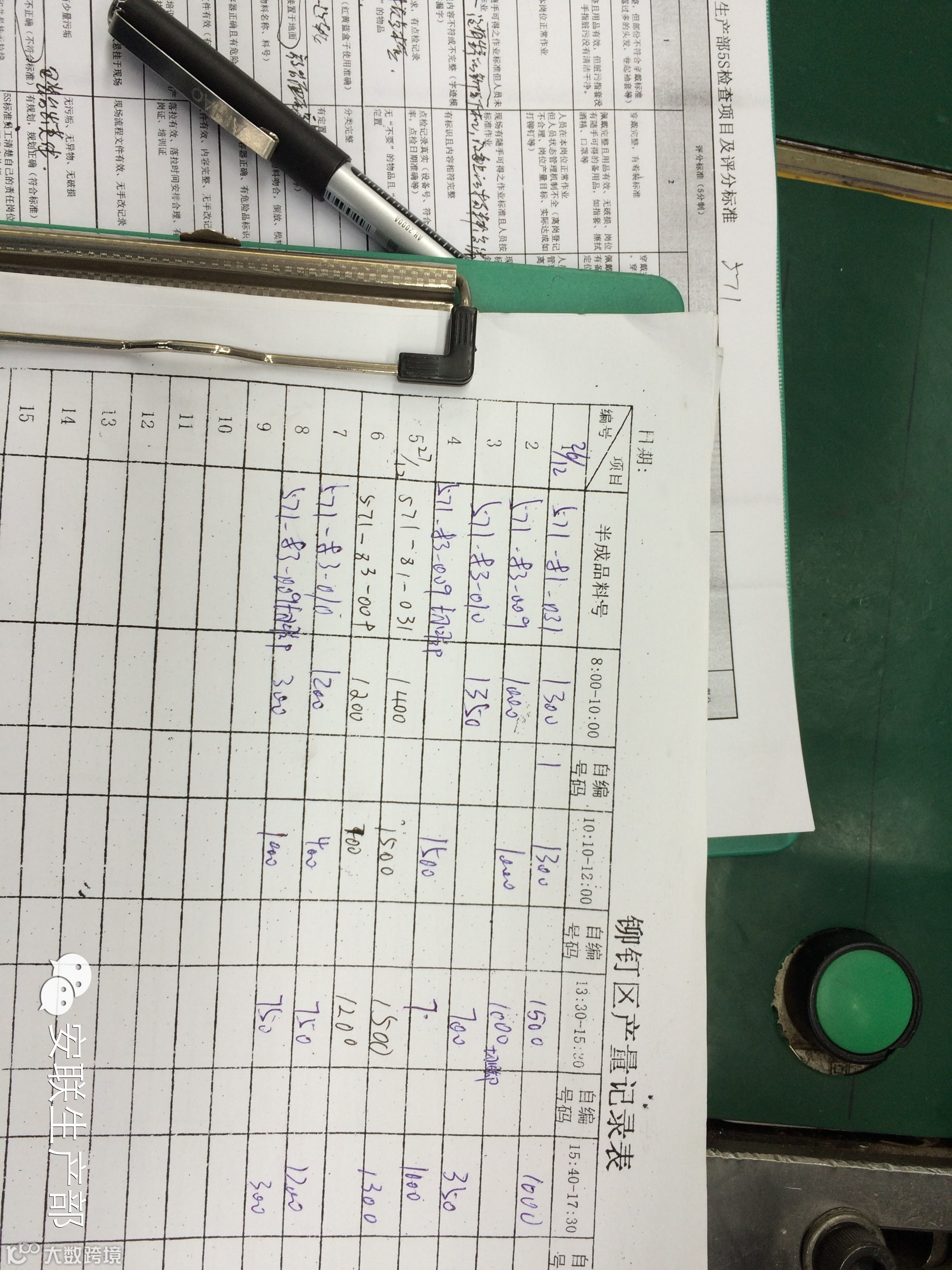 571/591问题点:(得分22分) 1.李进升没有戴厂牌、打铆钉员工没有扎起,两辫子离产品太近。 2.离岗记录不合理,不真实。 3.铆钉产能达成记录还是12月27日的,1月无记录。 4.没有生活的铆钉机上的铆钉没有收回,还放于设备台面上。 5.WI重叠现象严重,员工无法看到WI内容。 6.测试仪的转轴有编号,但没有编号对照表来批注使用的产品类型,不便于寻找。 7.技术员的点检时间还是14/12/30,1月没有做检查和记录。 8.订书机等工具放置位置与标示完全不符,放在了文件区。 9.重要的模块夹具放在设备上无定置无标示,易丢失。 10.生产中的原材料和成品放在一起,无区分无标示。 11.凸轮及组件无标示,放在台面无定置。 12。稀释剂无定置,危险标签破损无更新。 13.575的待测试成品,放置的标示卡是571的。 14.无人操作的岗位培训证没有回收。 15.包装记录无封面标示,内容里无填写拉线名称。 16.地面上有线材和棉签。 17.标示及标线破裂严重,无定期更新。 18.12月的员工岗位追踪记录没有归档回收。 19.办公桌上的标示卡存放凌乱,还有钥匙类的物品放在其中。 |