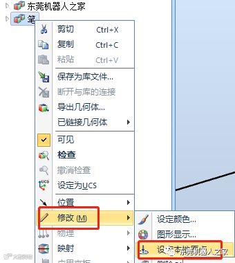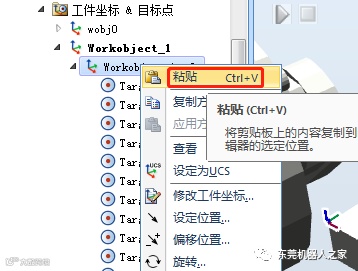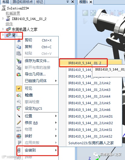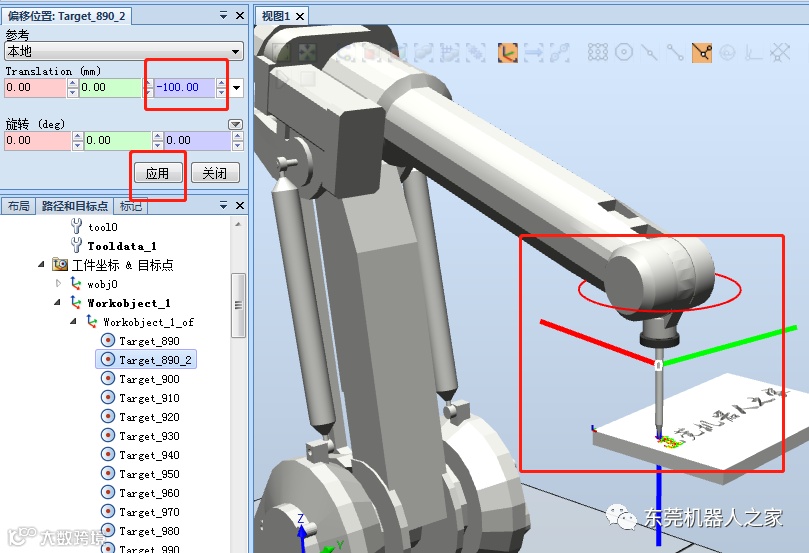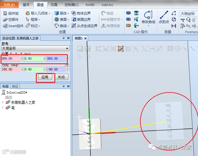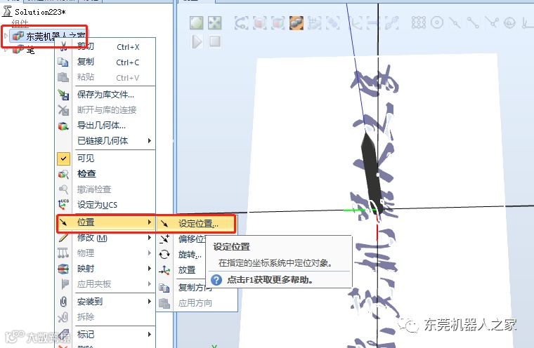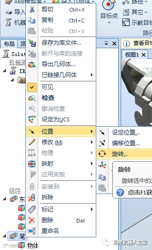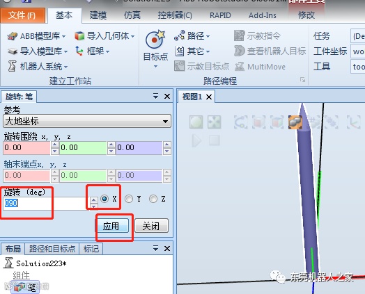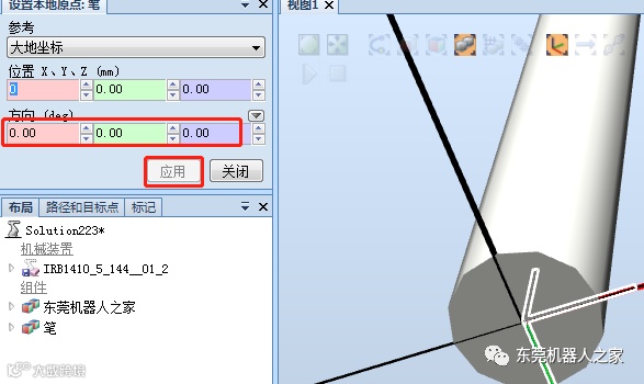 然后通过“位置——旋转——X轴90度”、“修改——设定本地原点”的方式,再把笔创建工具安装到机器人上面(创建工具方法可以参考前面的文章,在这不再赘述)。