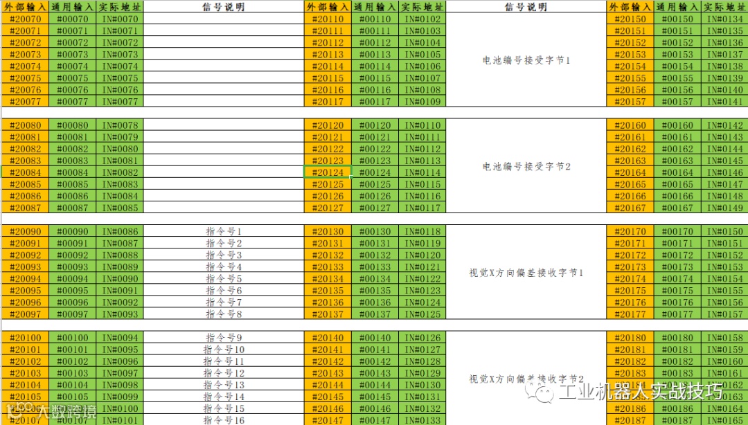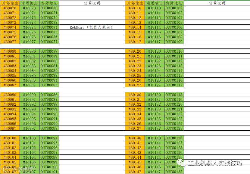 在先前提到的,假如机器人配置了CCLink通讯,在维护模式中设置好了通讯参数后,并且映射接口设置为输入为#20070至#20200共14字节,输出为#30070至#30200共14字节,下方就来分享如何将其映射到通用信号。项目之前就将IO表进行分配并且对应好,以便不会错误。