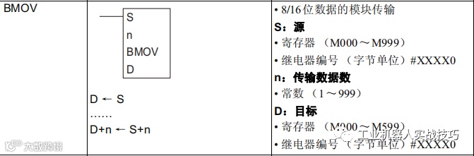 STR为常开触点,#70017为一直常通信号,使用BMOV指令,将#20090开始的2个字节数据关联到#00110开始的2个字节地址。