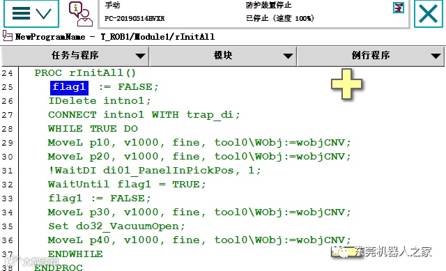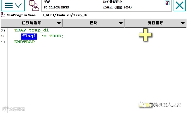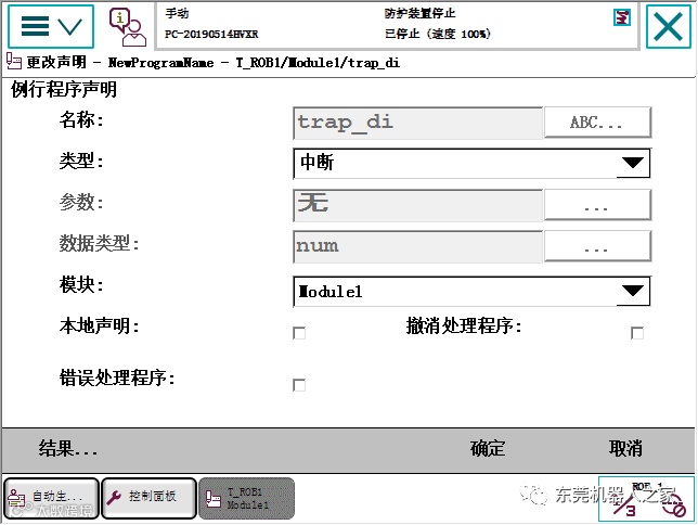 11)27行设置触发条件,即di01_PanelInPickPos由0变1,会自动触发运行trap_di程序(对于trap_di的扫描,后台一直运行,所以即使机器人没有运行到相关di语句,有了信号也会触发)