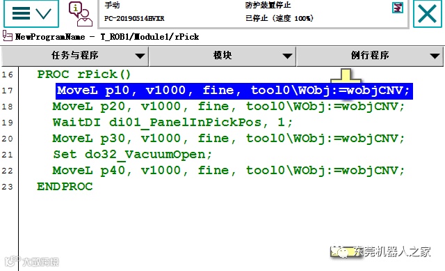2)如果机器人在执行第17行的时候,收到了di01_PanelInPickPos信号,而运行到第19行的时候,di01_PanelInPickPos信号被PLC置为FALSE了,那么执行第4行的时候,机器人就会一直等待信号。