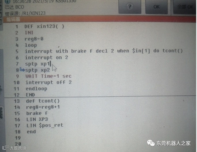 KUKA机器人中断路径恢复程序如下: