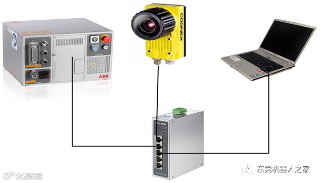 由于ABB工业机器人本身无法进行摄像头的编辑调试工作,需要连接仿真软件Robotstudio才能实现。因此需要调试时连接还需要添加路由器或者交换机。通过交换机可将各设备连接在一起,如下图所示。