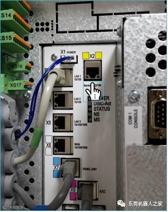 ABB工业机器人使用集成视觉功能连接摄像头,可使用ABB工业机器人自带的以太网口,在控制柜中选择X2端口,如右图所示。