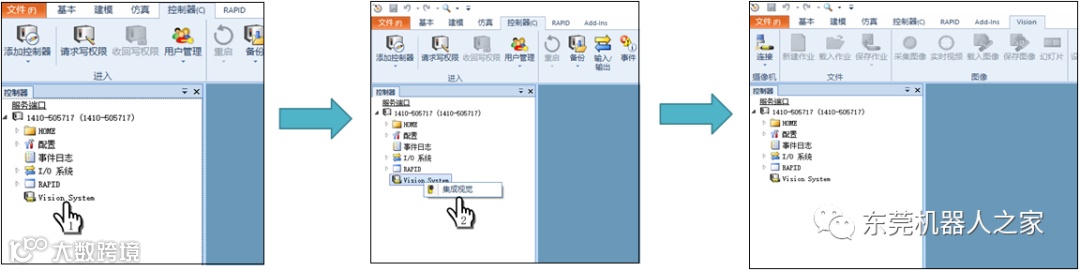 (1)将硬件连接完成后,打开RobotStudio在线连接ABB工业机器人,拥有1341-1/1520-1 Intergrated Vision Interface系统选项的可在控制器界面看到有Vision System菜单,通过此菜单进行视觉系统配置,将鼠标移到Vision System点击右键,选择集成视觉,打开视觉调试界面。