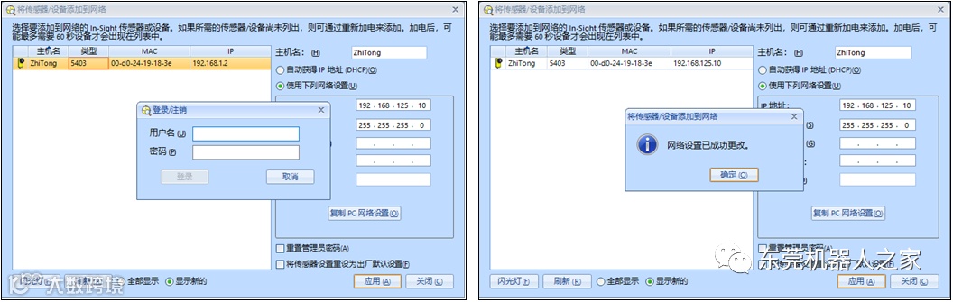 如果相机与Robotstudio软件连接正常,将会弹出此时需要正确输入相机的用户明和密码才能进行登录,相机默认的用户名为:admin ,默认密码为空。当提示“网络设置已成功更改”,则表示摄像头的IP地址已经修改完成。
