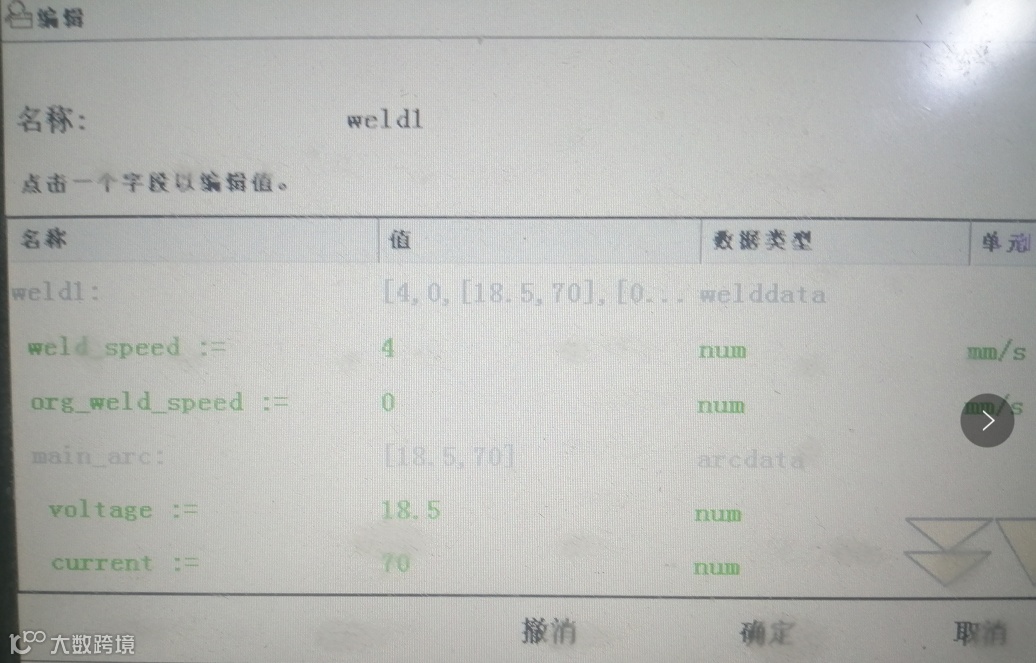 摆弧数据(WeaveData)是控制机器人在焊接过程中焊枪的摆动,通常在焊缝的宽度超过焊丝直径较多的时候通过焊枪的摆动去填充焊缝。该参数属于可选项,如果焊缝宽度较小,在机器人线性焊接可以满足的情况下可不选用该参数,需要设定的参数如下表