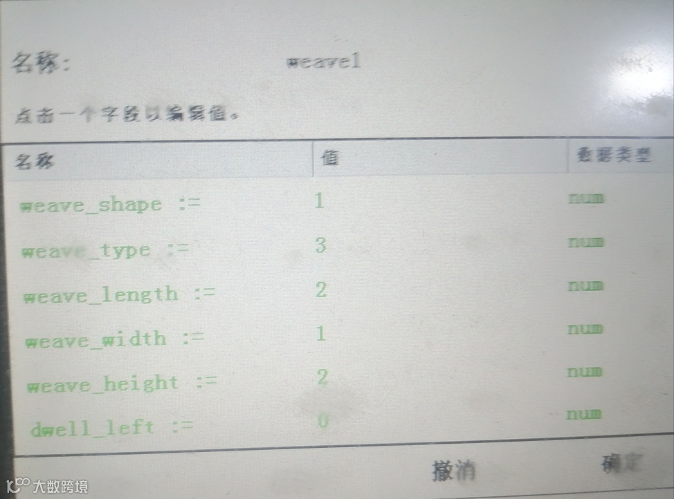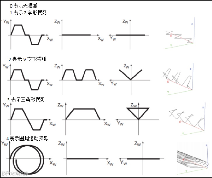 Weave_shape:摆动的形状(0表示没有摆动,1表示Z字形摆动,2表示V字形摆动,3表示三角形摆动,4表示圆周运动摆弧)。