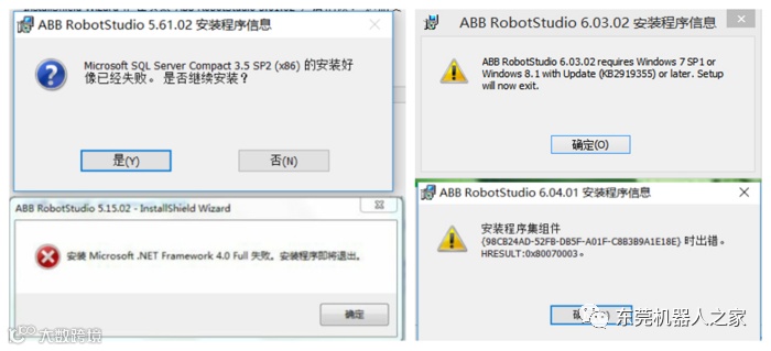 有很多人在初次安装RobotStudio软件时都会遇到安装失败的情况,报错提示也是五花八门,下图所示为部分报错截图。