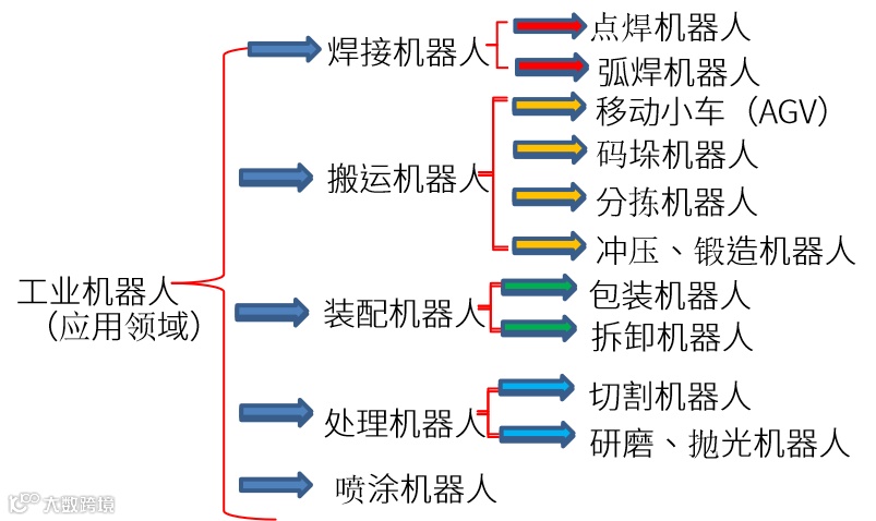 关于工业机器人的分类,国际上没有指定统一的标准,可按负载重量、控制方式、自由度、结构、应用领域等划分。
