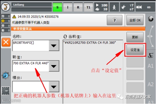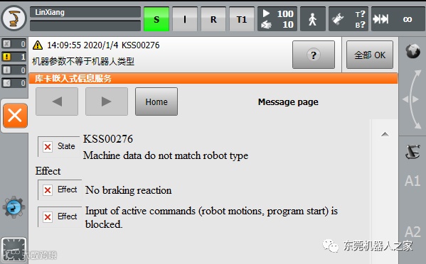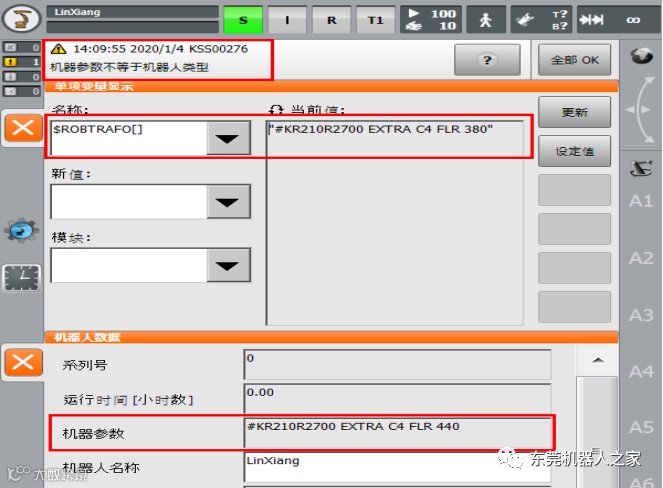 机器人首次投入运行时,因为出厂设置问题,或机器人本体和控制柜有过更换之后,会出现“KSS00276 -机器人参数不等于机器人类型”报警。
