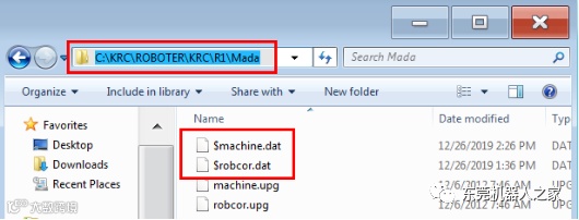 2)用与机器人铭牌对应的两个机器人参数文件替换掉路径:C:\KRC\ROBOTER\KRC\R1\Mada中的$machine.dat和$robcor.dat文件。