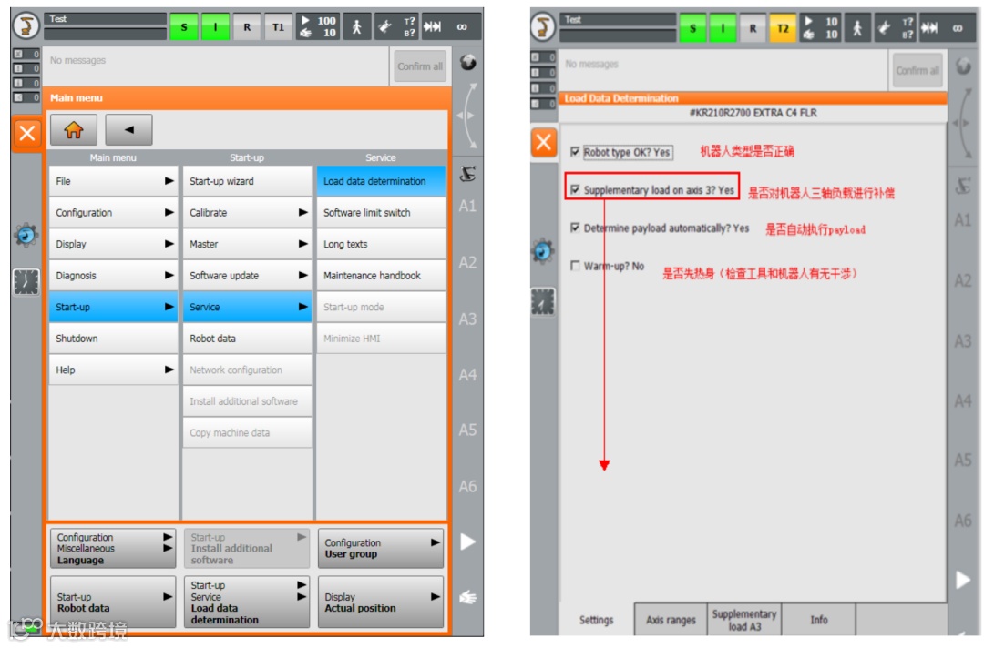 1.由于 KUKA 软件原因,需在英文环境下才可以保存数据,开始前请切换语言至英文。在机 器人主菜单中选择 Start-up→Service → load data determination,如下图