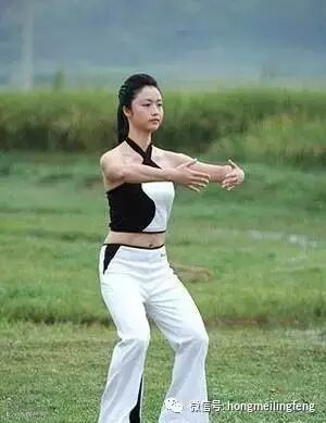4、握扇法---直立,腿稍稍弯曲,手臂略抬起,手如握扇姿势,轻轻向内扇摆动。