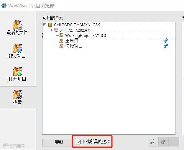 信息窗口提示未安装选项,意思是有软件包没在电脑的 WorkVisual 上面安装,休想上传项目。破局之道就藏在下载项目时的窗口里,勾选更新按钮旁的 “下载所需的选项”,之后重启 WorkVisual 就可以了。