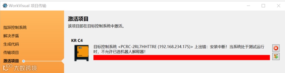 目标控制系统 <PCRC-2RL7HHTTRE(192.168.234.175)>上出错:安装中断!当系统处于测试运行时,不允许已选机器人解释器!